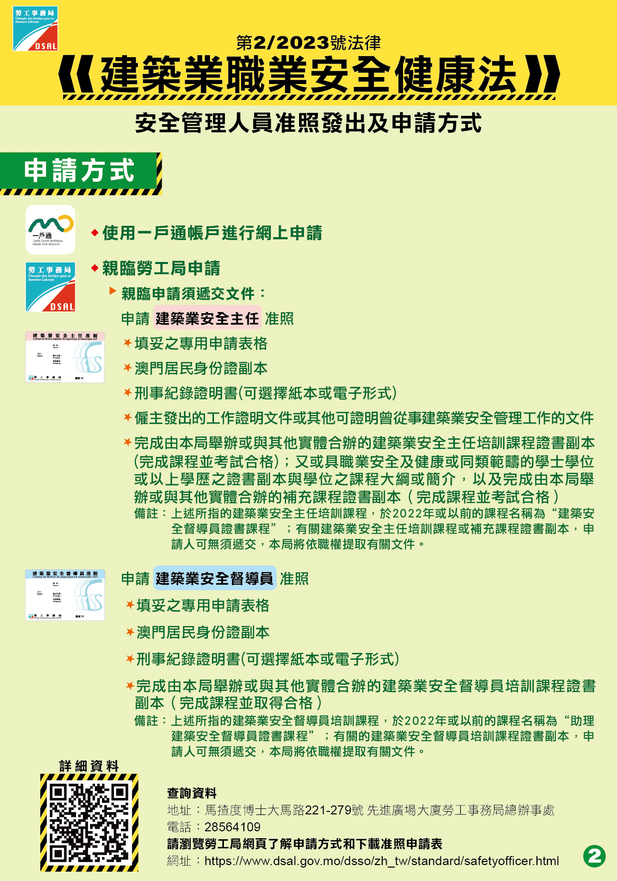 隨著《建築業職業安全健康法》即將於11月1日生效,勞工局提醒有意在11月1日後擔任安全管理人員而尚未申請准照的合資格人士,應盡快提出申請。符合資格人士可登入“一戶通”手機應用程式,選擇“建築業安全主任/安全督導員准照申請”,然後按照界面指示輸入資料及上載相關證明文件後,便可完成申請手續;申請人亦可親臨勞工局辦理申請手續,申請表格可於勞工局網頁下載或於勞工局辦事處索取(地址:馬揸度博士大馬路221-279號先進廣場大廈)。有關建築業安全主任和安全督導員准照申請詳情,可瀏覽勞工事務局網站 www.dsal.gov.mo 或於辦公時間內致電28717781查詢。有關“一戶通”的申請手續,可瀏覽政府入口網站( www.gov.mo )。
