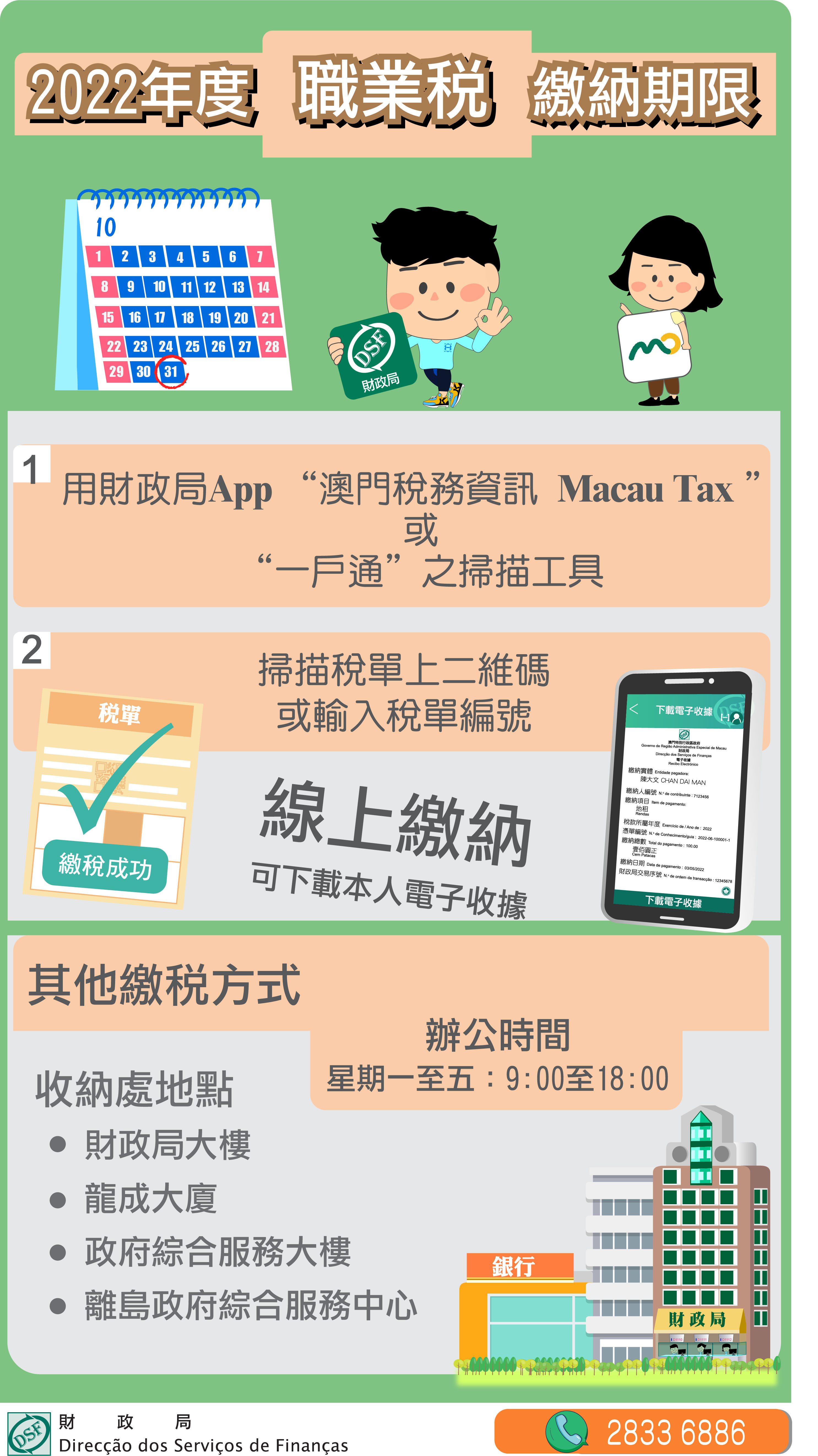 財政局提醒納稅人,2022年度從收益中扣繳之職業稅稅款及結算稅款間之差額,最後繳納期限至10月31日。為免因逾期繳納而附加過期利息及罰款,仍未繳納上述稅款之納稅人須儘快繳納。