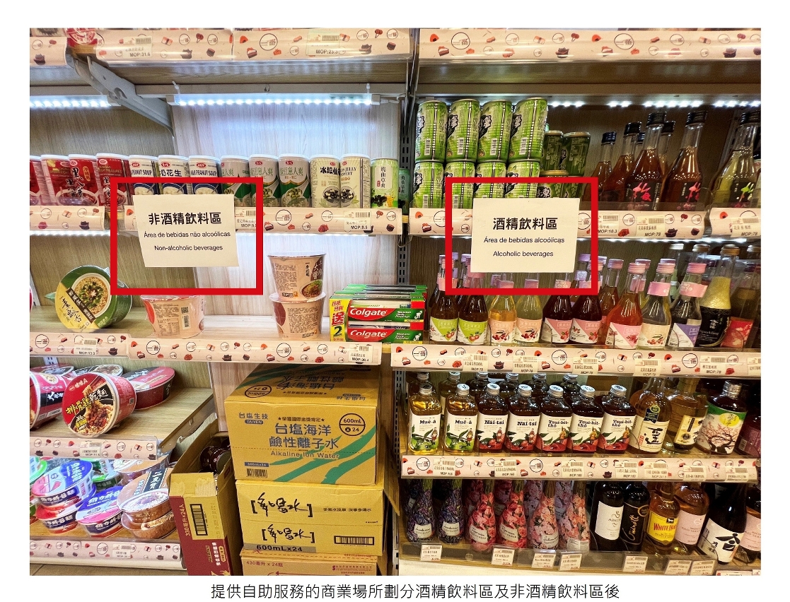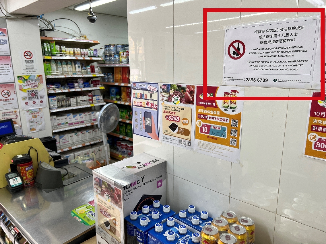 第6/2023號法律《預防及控制未成年人飲用酒精飲料制度》(下稱《控酒法》) 將於11月5日起正式生效。《控酒法》規定,銷售或提供酒精飲料的地方,須以顯眼方式張貼經行政長官批示核准禁止向未成年人銷售或提供酒精飲料的標誌。《控酒法》同時規定,屬提供自助服務的商業場所須劃定及清晰標示陳列酒精飲料及非酒精飲料的區域,而酒精飲料的廣告應以中文、葡文及英文標明警語。