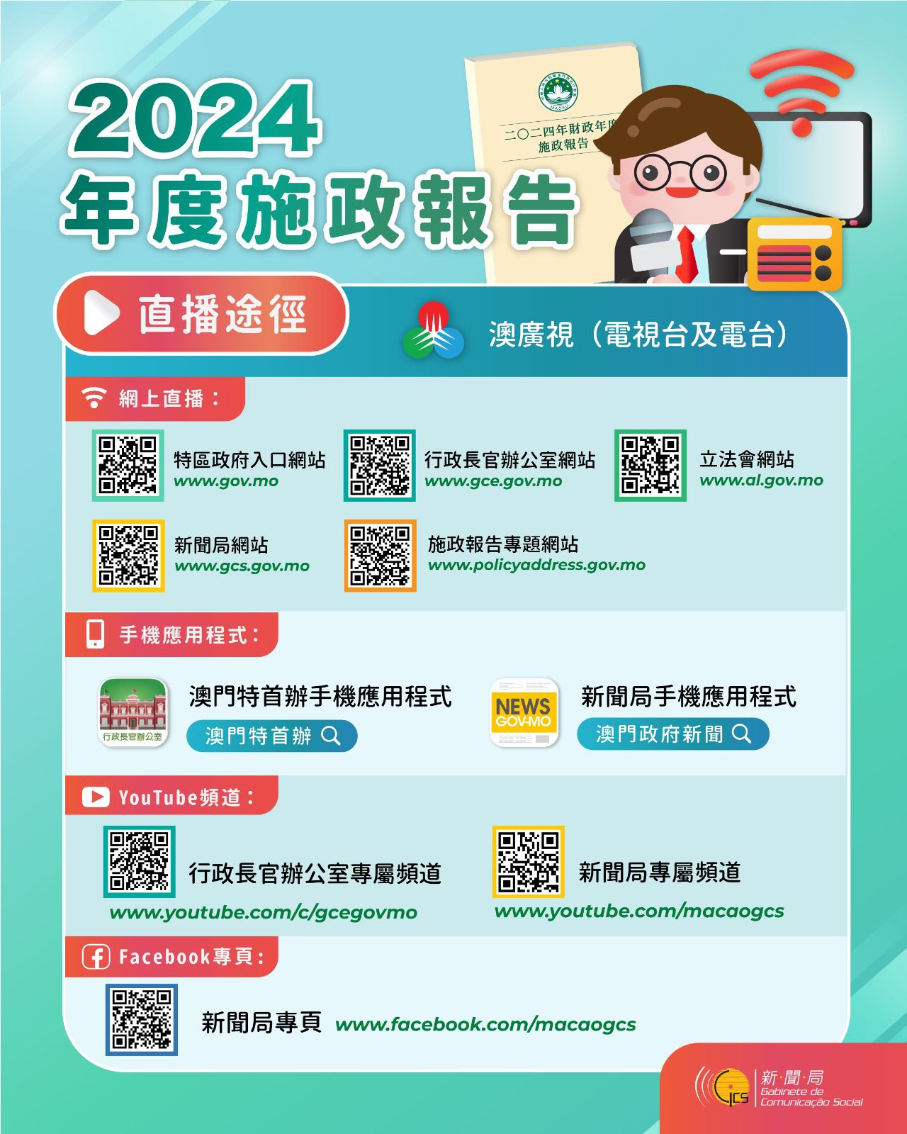 澳廣視屬下電視台及電台屆時將會現場直播。公眾亦可透過澳門特別行政區政府入口網站,行政長官辦公室、立法會和新聞局的網站,施政報告專題網站,行政長官辦公室和新聞局的手機應用程式及專屬Youtube頻道,以及新聞局Facebook專頁,觀看網上直播。