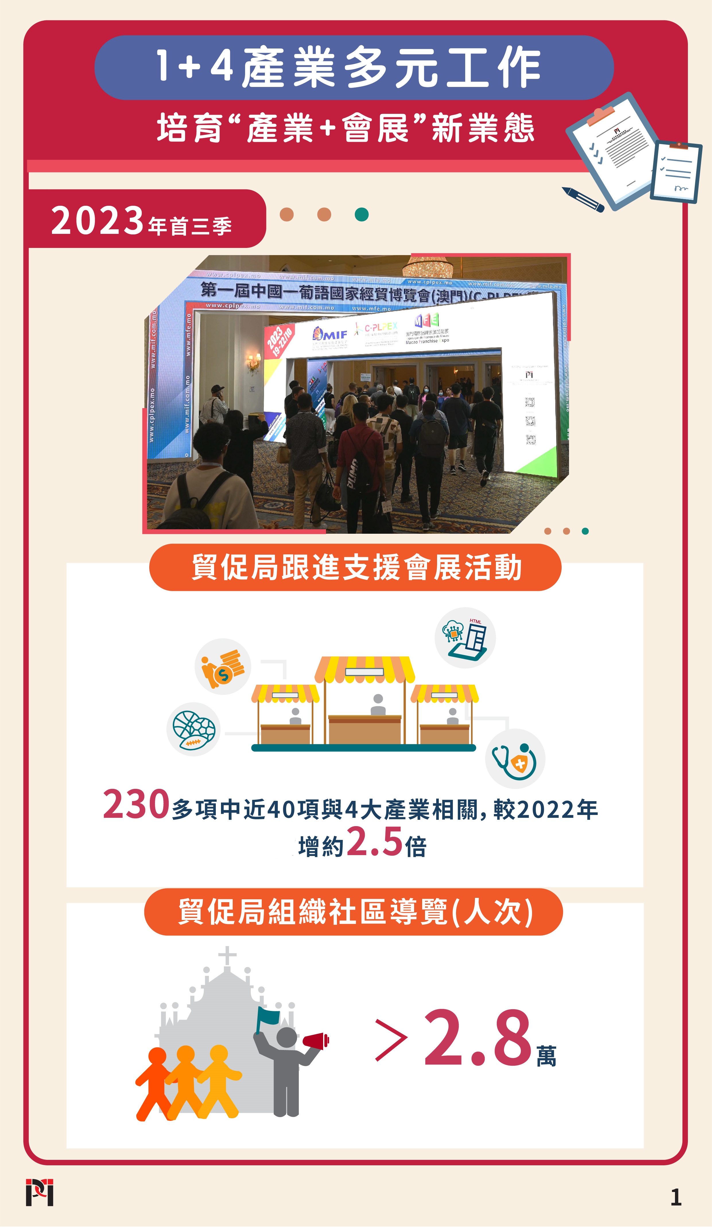 今年首三季貿促局累計組織2.8萬多人次的會展客商深入澳門各區遊覽消費,結合“會展+旅遊"聯動發展,助力會展業界及企業拓展市場,推動社區經濟。