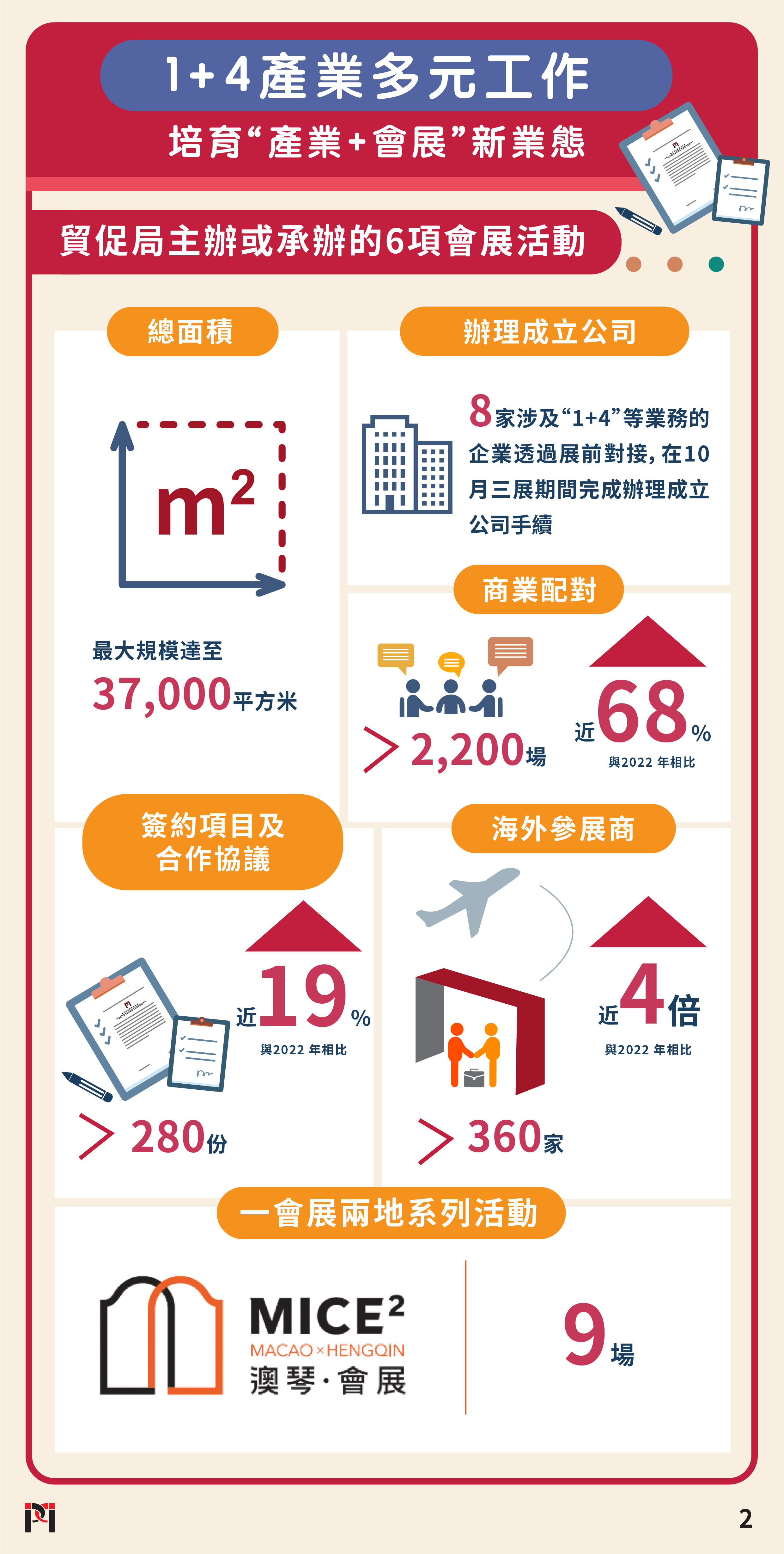 圍繞“1+4”適度多元發展策略,部署系列精準商業配對、專題配對洽談、專題論壇提升企業對接成效,加大“以展招商”功能。6項會展活動共安排超過280份簽約項目及合作協議,逾2,200場商業配對,與去年相比分別上升近19%及68%。