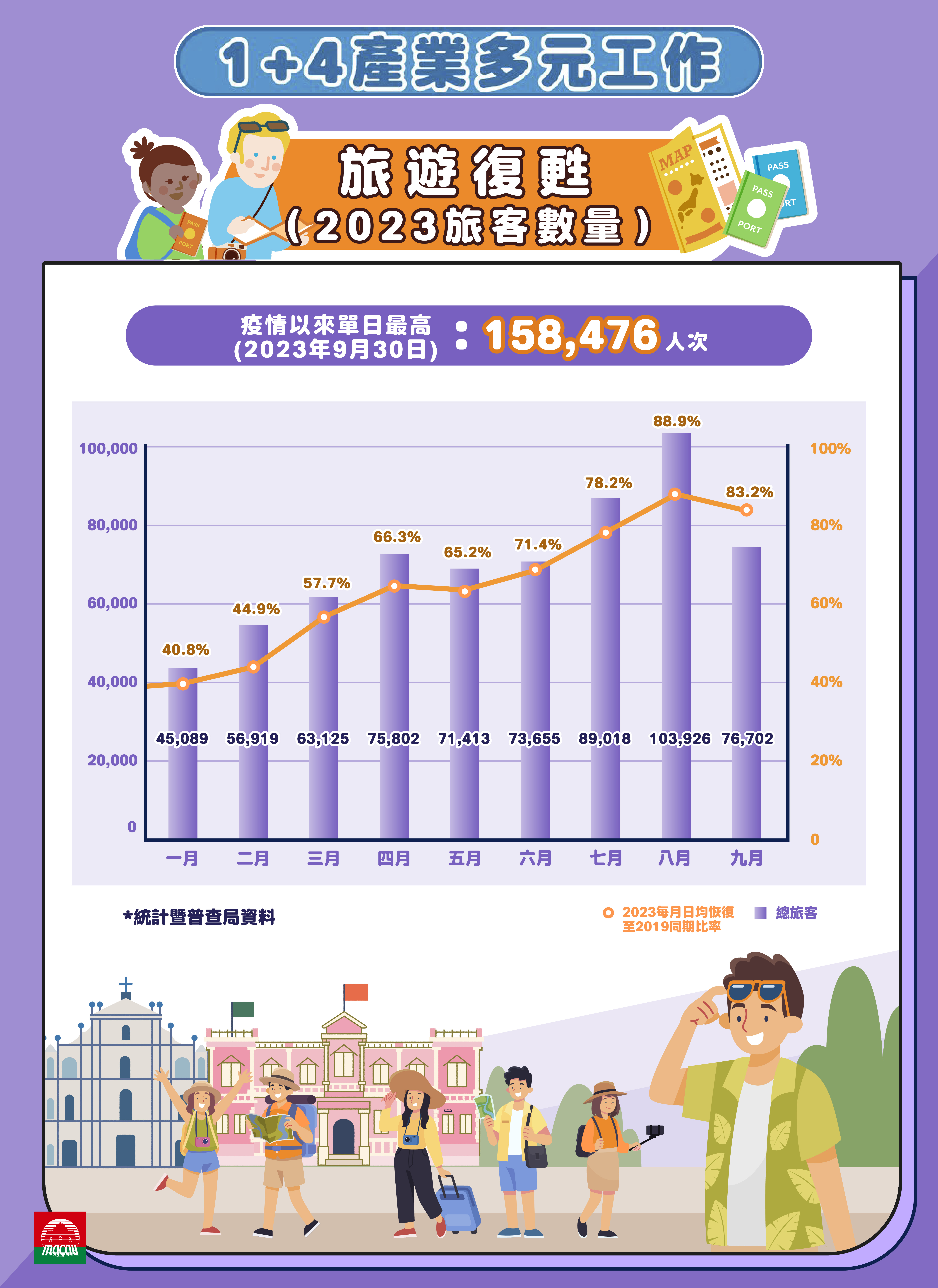 旅遊局配合特區政府“1+4”適度多元發展策略,持續深化“旅遊+”跨界融合。隨着今年初澳門對外全面通關,各客源市場宣傳工作隨即啟動,來澳旅客數量持續穩定增加,至今成效顯著。旅遊局致力加強旅遊業與關聯產業的互動發展,不斷豐富旅遊元素,廣納客源,發揮綜合旅遊的牽頭作用,推動經濟適度多元發展,促進澳門經濟復甦。