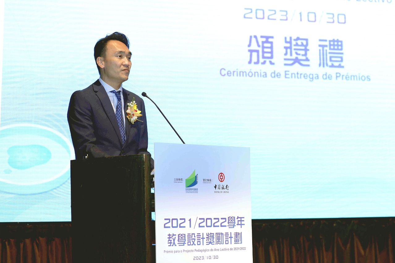 龔志明局長致辭時表示,教青局自1996年起設立“教學設計獎勵計劃”,至今累計獲獎的作品近5,000份,匯集了教學人員的教學精髓和辛勤成果。高質素和高水平教學離不開高質量的師資隊伍,未來教青局將繼續推動和支持教學人員的專業發展需要,期望教學人員能繼續在課程與教學、教學研究精益求精。陳榮達副總裁表示,澳門中銀自2020/2021學年起連續三年支持“教學設計獎勵計劃”,以實際行動感謝教學人員對澳門教育工作的投入和熱誠,為澳門教育事業出一分力。未來澳門中銀將繼續秉持“根植澳門、服務澳門”的經營宗旨,積極配合和支持社會各界為教育事業發展做出更大貢獻。