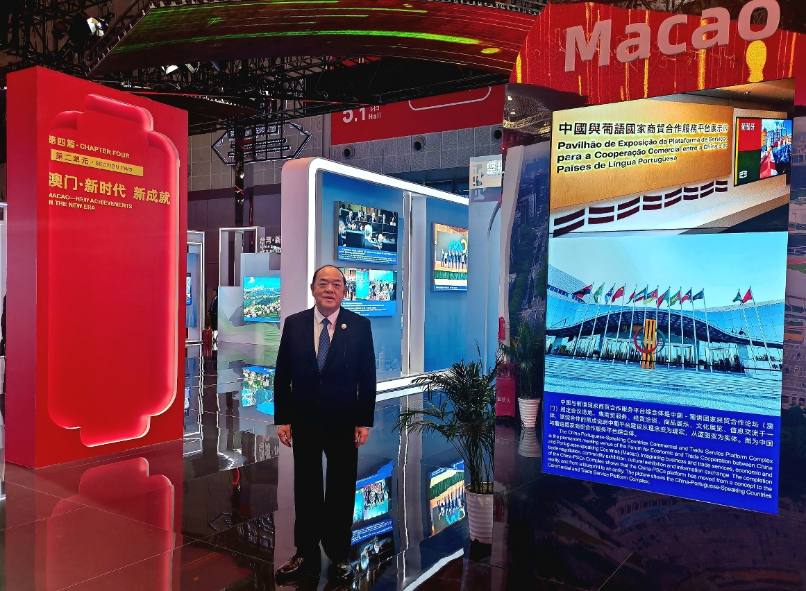 行政長官開幕式後在中國館澳門展區,向李強總理等介紹澳門展區內容及澳門的整體發展現況。澳門展區的主題為“澳門‧新時代 新成就”,展示了“堅持與時俱進,提升治理水平”、“堅持開拓創新,推動經濟持續健康發展”及“展望澳門未來發展藍圖”三大主要內容。