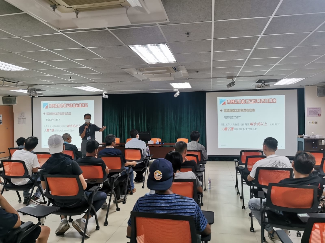 講座由勞工局代表講解相關職安健知識,包括:高空工作安全、安全使用電力、手動及電動工具使用安全、吊運工作安全、體力處理操作,以及相關職安健法例和應採取的安全措施等,並促請承辦商須向人員提供合適的工作平台及個人防護裝備,改善施工程序,以確保人員工作安全。