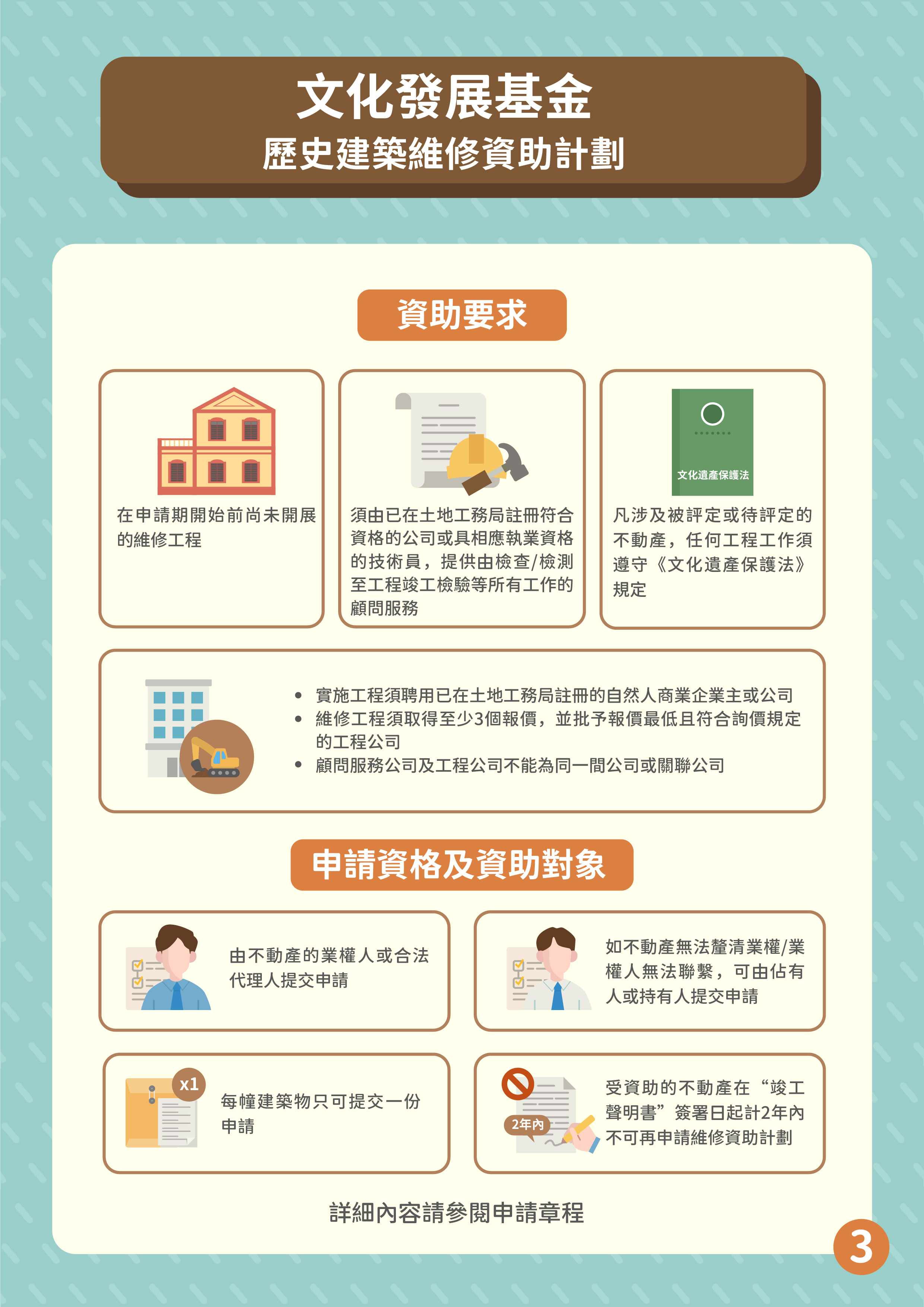 文化發展基金為加強推動歷史建築的保護和活化,推出“歷史建築維修資助計劃”,透過資助提升業權人自主開展定期維修保養的積極性,加強對文物建築和具文化價值建築的保護。