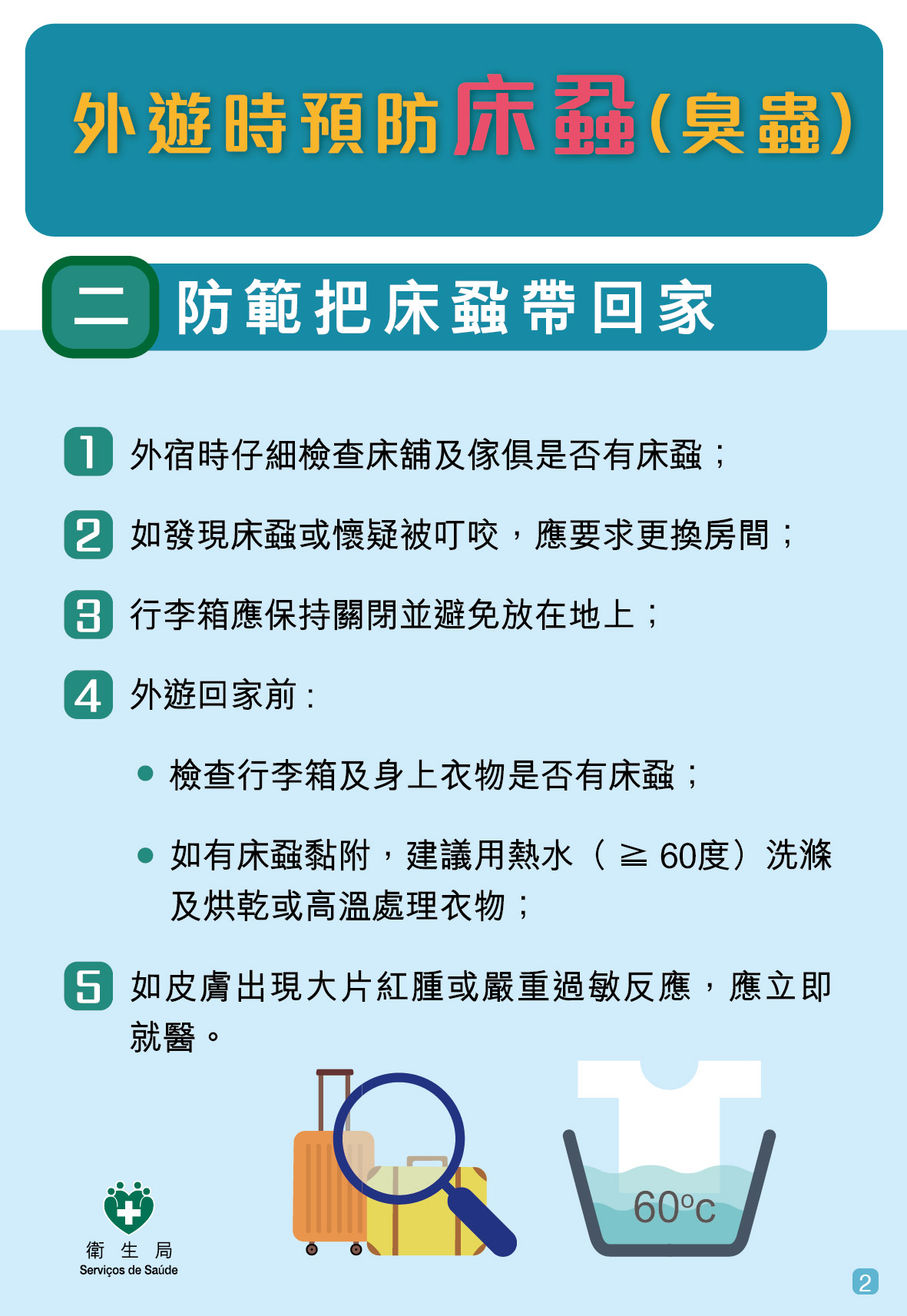 - 居民外遊回家前應先檢查行李箱的車輪及暗角位置,以及檢查身上的衣物是否有臭蟲黏附;如有懷疑蹤跡,建議參考以上方法用熱水和蒸氣處理衣服及物品;