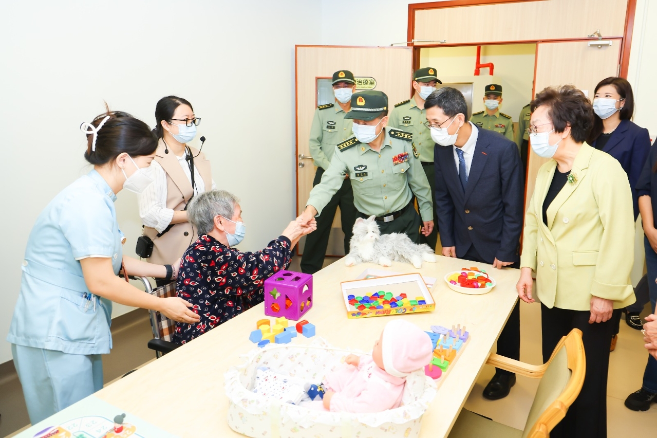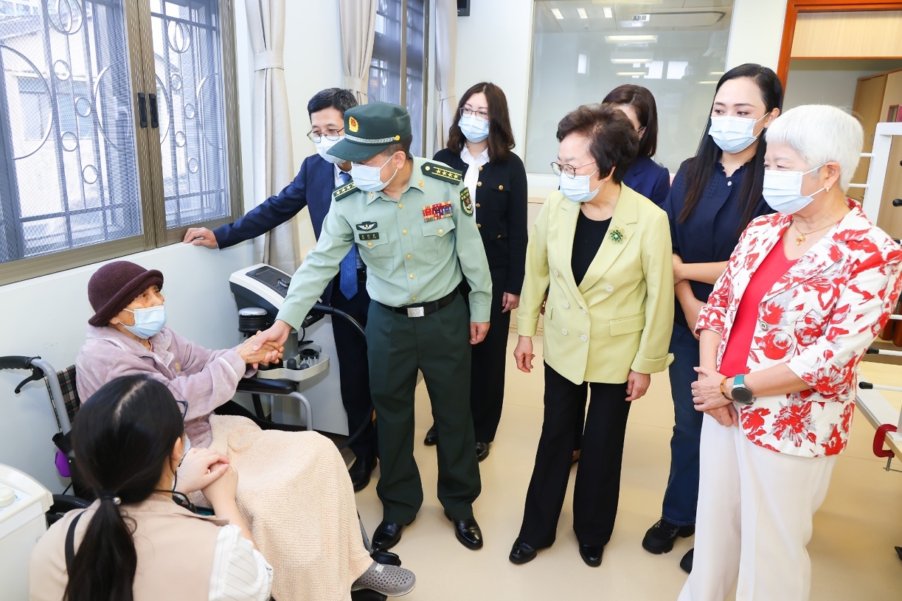 駐澳部隊官兵代表和社會工作局人員首先參觀了母親會下環長者綜合服務中心院護服務樓層,於起居室與長者互動,亦慰問臥床安養的長者,向他們致以真摯的祝福,肯定他們為澳門建設發展做出的貢獻。