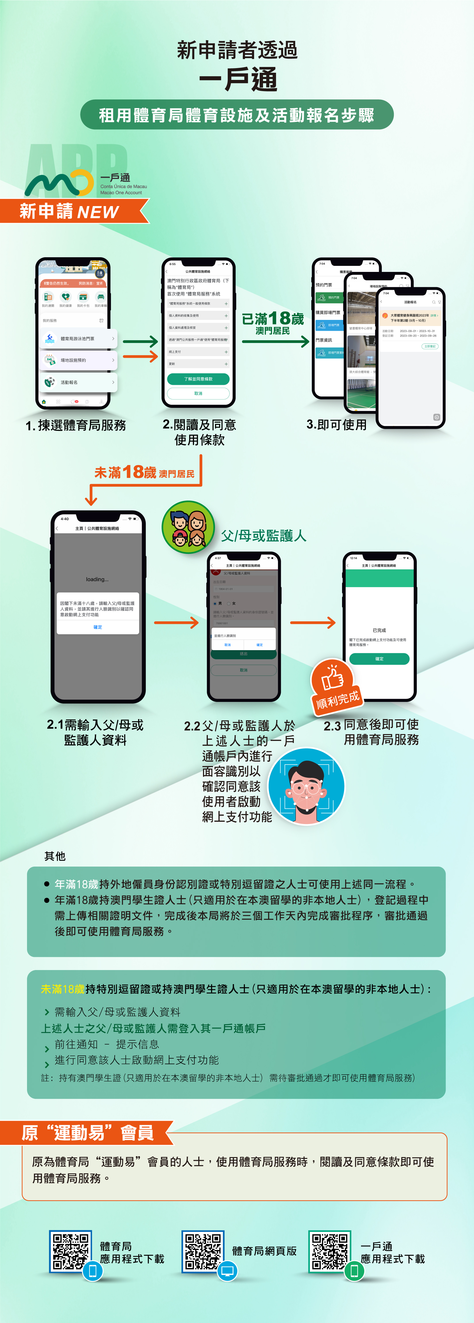 | *由於使用體育局服務涉及網上付款,因此18歲以下的人士需獲得父母或監護人同意,並可透過“一戶通”、體育局網站或體育局手機應用程式於線上進行有關操作。 |