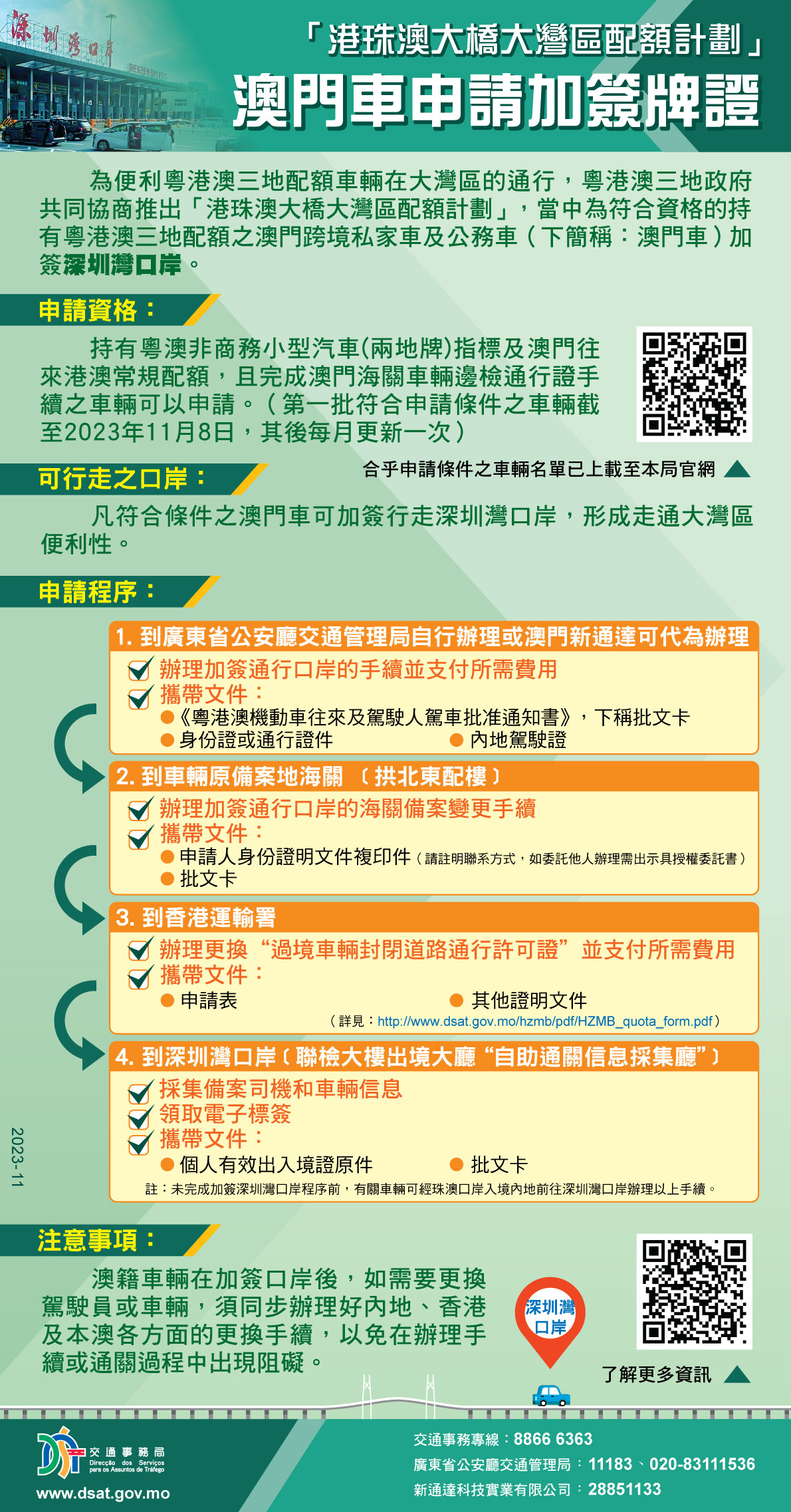 為進一步善用港珠澳大橋和配合粵港澳大灣區發展,落實粵港澳大灣區規劃綱要“關於促進人員貨物往來便利化” 的戰略規劃,粵港澳三地政府於2019年10月推出“港珠澳大橋大灣區配額計劃(試驗)”, 並於今年12月1日起推出第二期計劃,公眾可於“港珠澳大橋大灣區配額計劃"專頁(https://www.dsat.gov.mo/hzmb/quota_plan.aspx)查閱申請流程和內容、車輛和駕駛人加簽辦理地點詳情,並可於12月1日上午10時起透過連結: https://www.dsat.gov.mo/GBQuotaCheck/GBQuotaQuery.aspx 查詢車輛是否符合申請條件(局方將每月定期更新符合參與條件的澳籍車輛名單)。截至今年11月8日,逾千台輕型汽車有條件參與“港珠澳大橋大灣區配額計劃”。