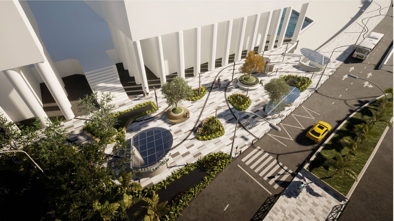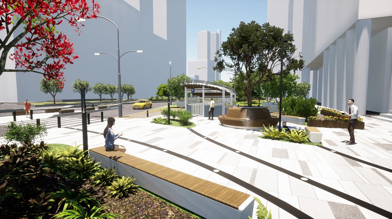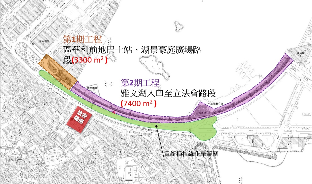 工程計劃分兩期進行,第一期工程面積約3,300平方米,由區華利前地巴士站至湖景豪庭廣場路段,更換廣場飾面、增加綠化及休憩設施、增設燈具並加強夜間照明以提升廣場整體氣氛;通往下層之圓形樓梯則增設玻璃雨篷,另外利用綠化帶分隔地庫排風口,改善出風口對路人之影響,同時調整斑馬線位置,擴大安全島等候空間,改變行人過馬路的動線,避免行人過路時途經排風口。
