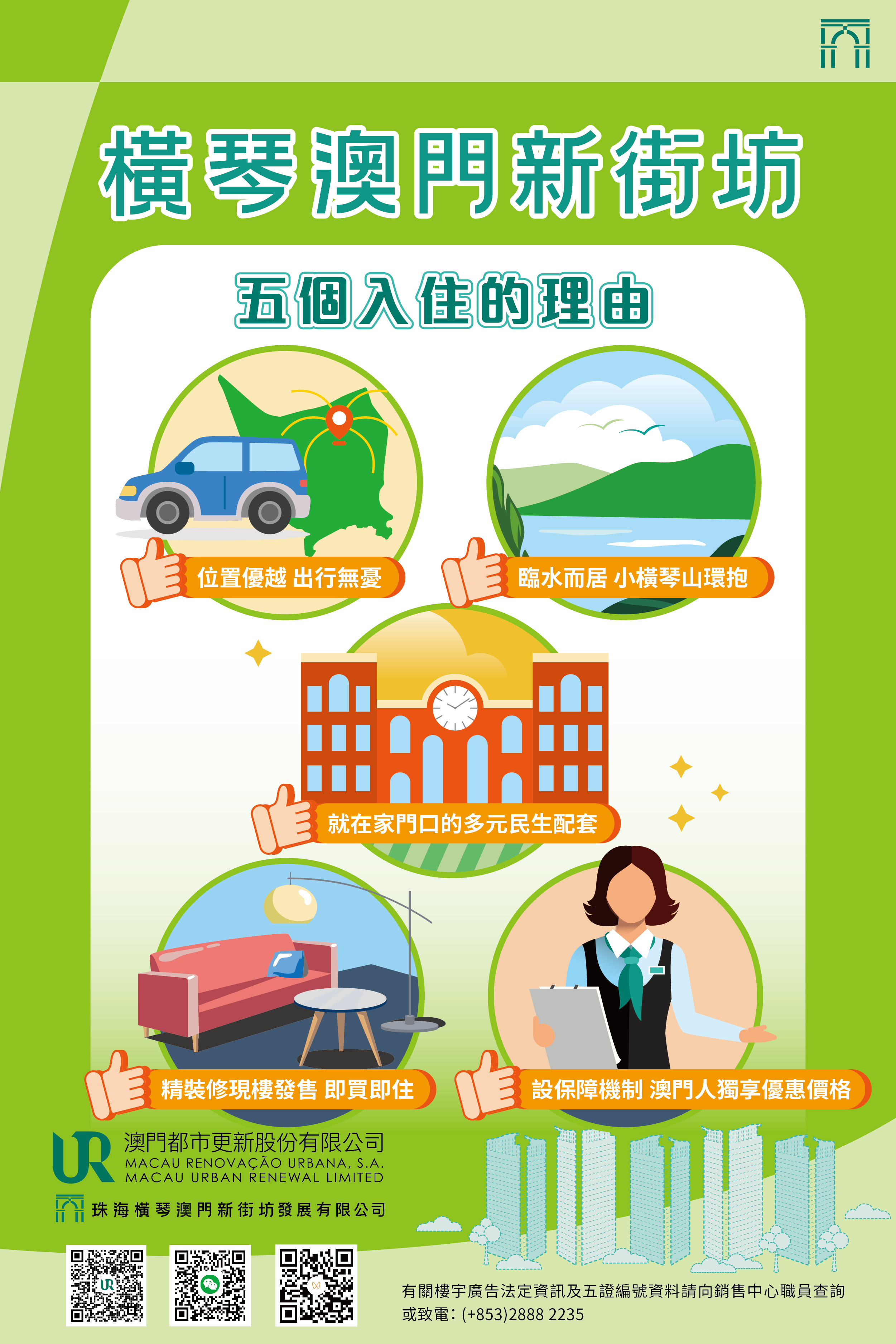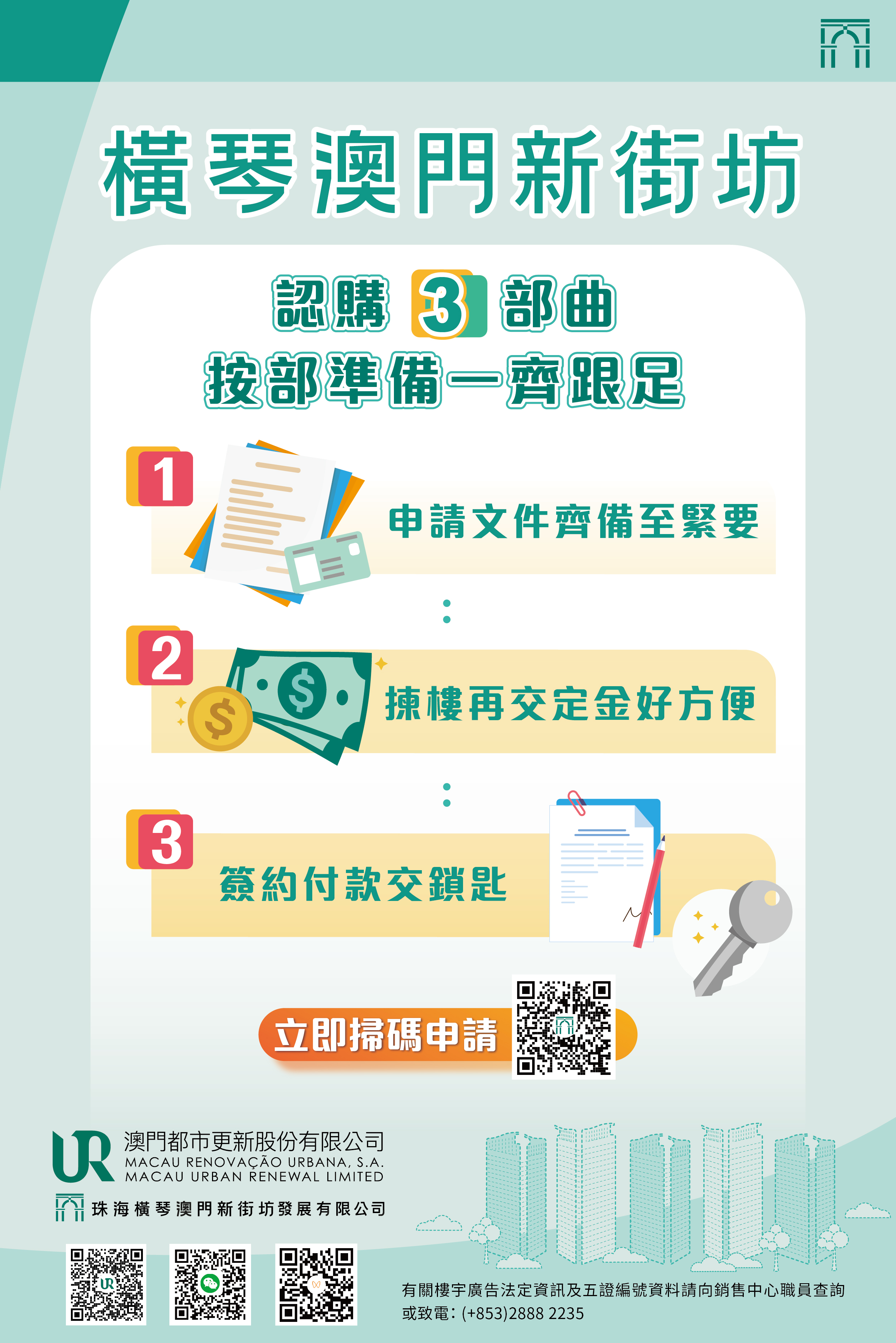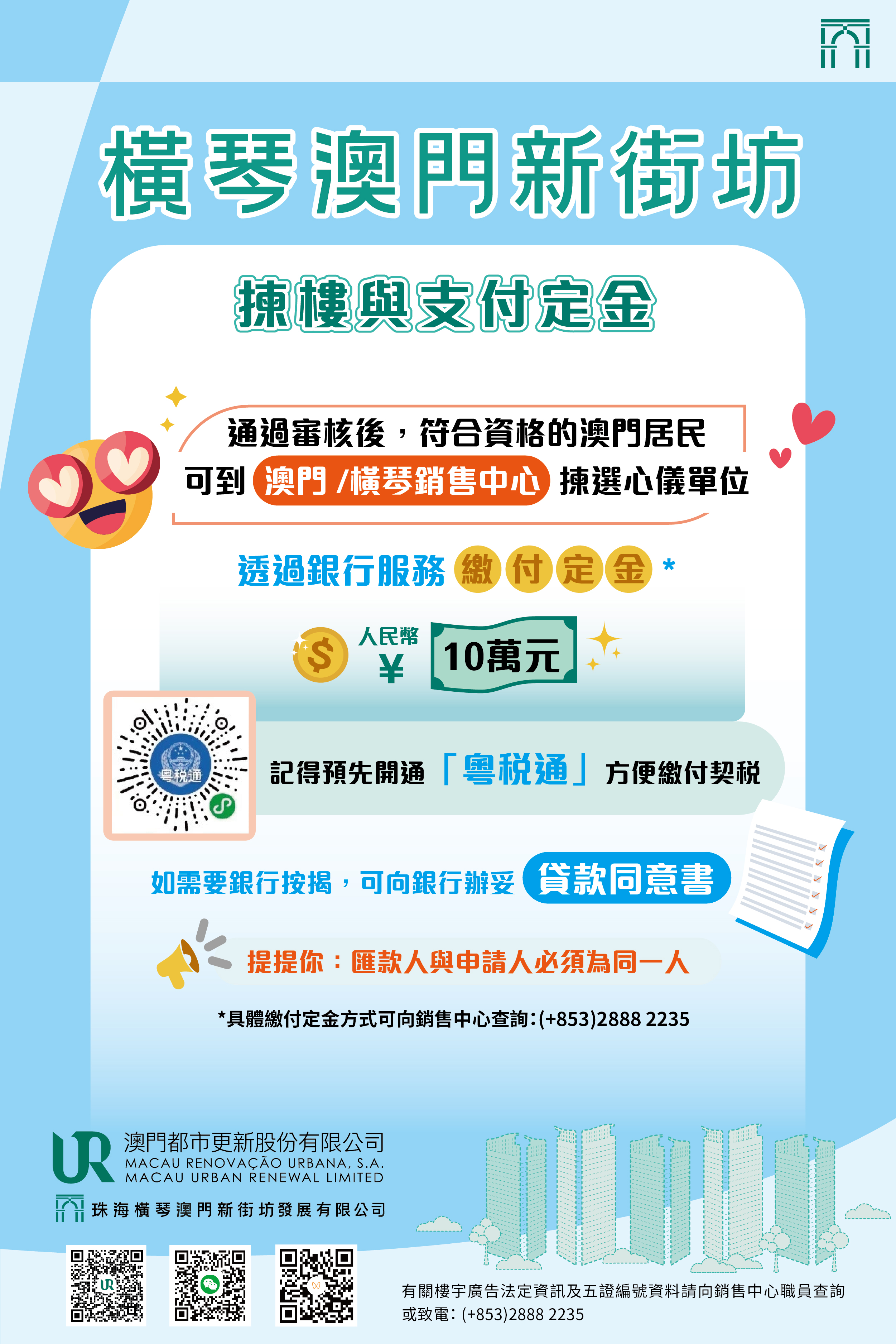 如欲了解詳情,可登入澳門新街坊專題網頁(https://mur.com.mo/mnnproperty)或電郵至mnn_property@mur.com.mo或致電(853)2888 2235了解橫琴「澳門新街坊」認購申請事宜。