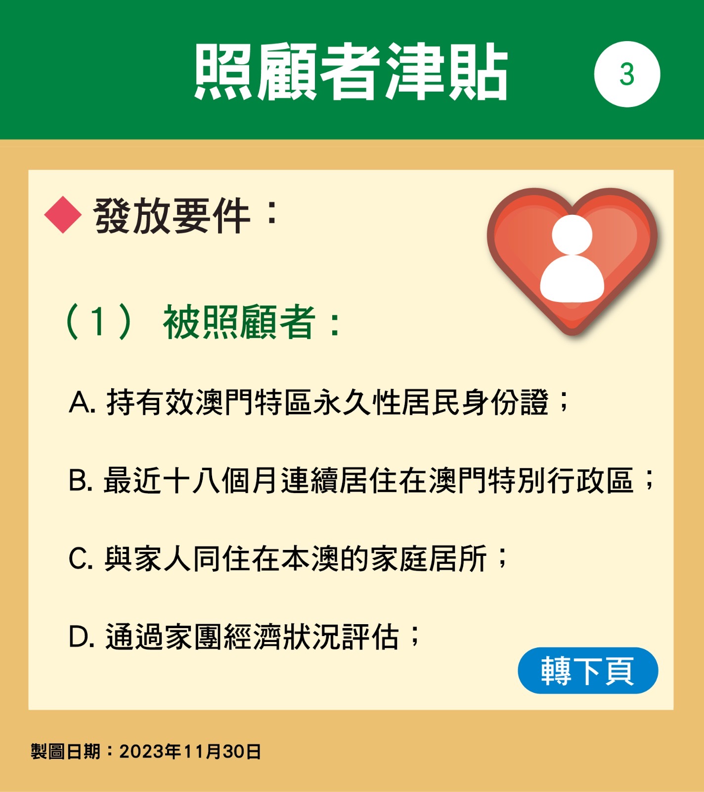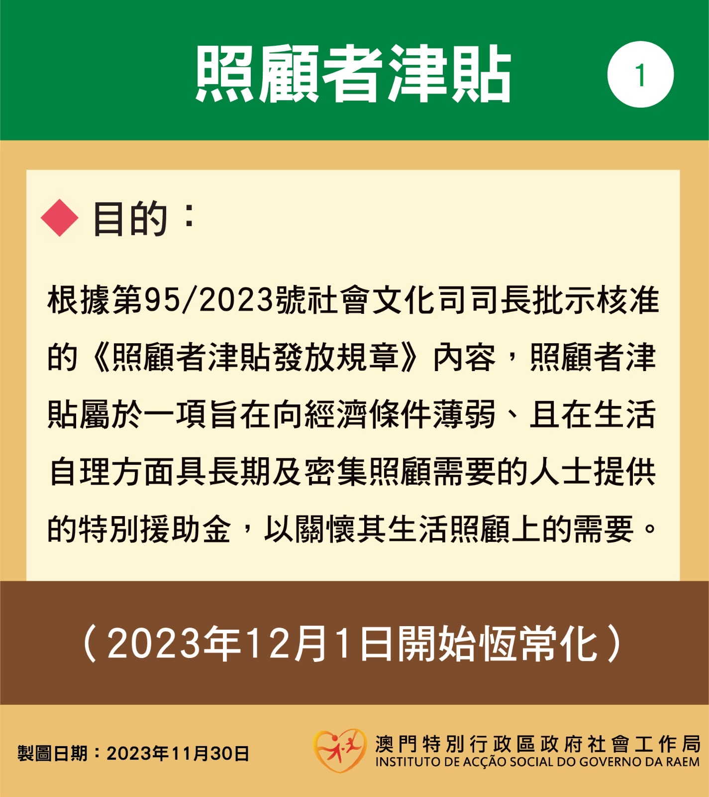 第95/2023號社會文化司司長批示核准的《照顧者津貼發放規章》(下稱規章)於12月1日開始生效,照顧者津貼正式轉為恆常性措施。規章訂定了有關津貼的發放制度與相關安排,社會工作局將按照規章的規範內容,跟進有關申請、審批、發放、監察和覆查等工作。