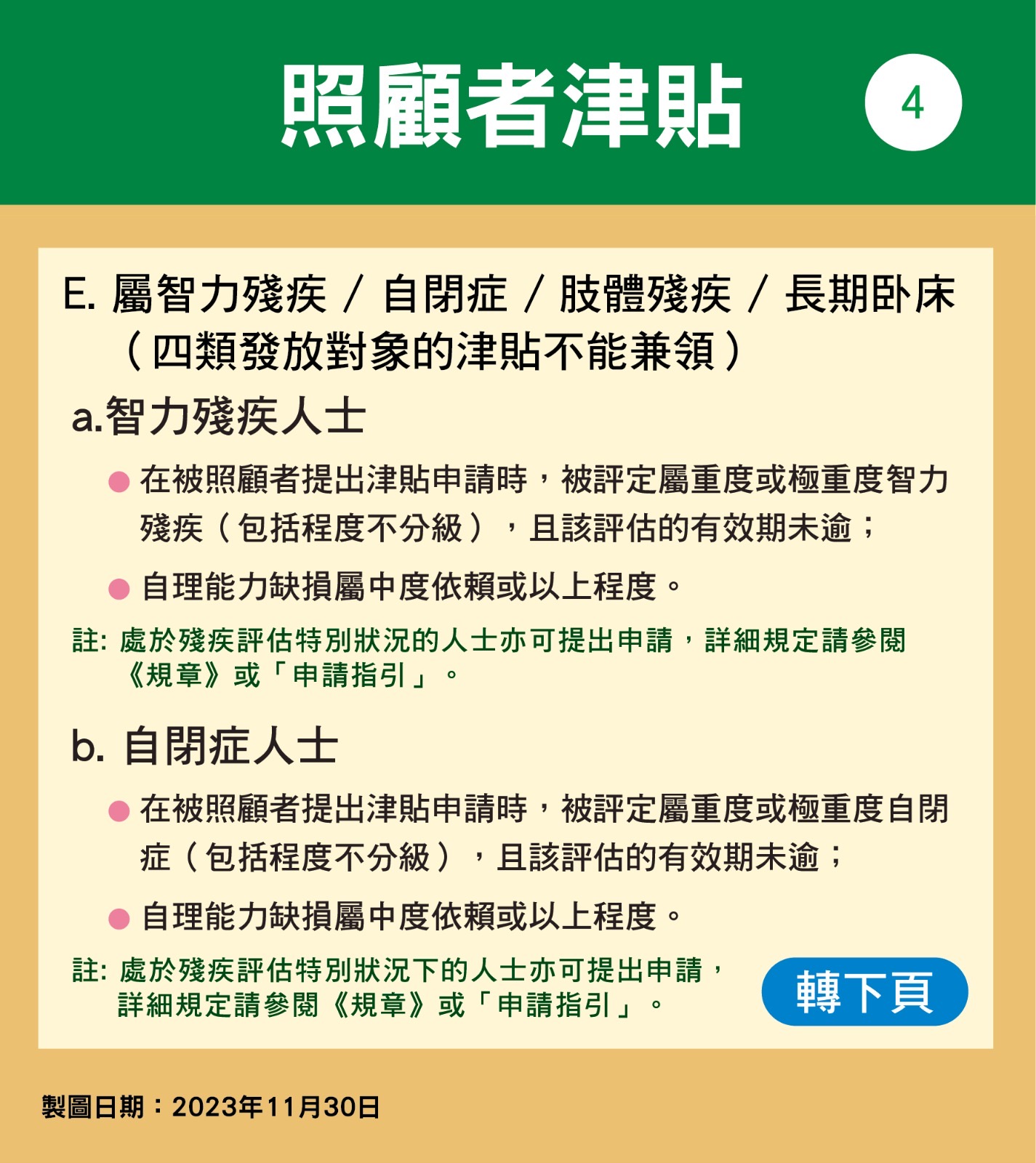 照顧者津貼轉為恆常性措施後,政策目的維持不變,旨為經濟條件薄弱、且在生活自理方面具長期及密集照顧需要的人士提供特別援助,以關懷其生活照顧上的需要。符合規章所定下列要件的四類人士,可按相關規定向社會工作局遞交申請,不設截止期限: