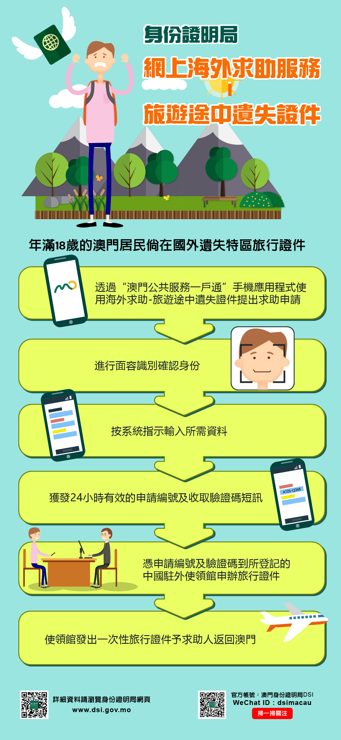 有關“網上海外求助服務—旅遊途中遺失證件”詳情,請參閱 www.dsi.gov.mo/ooas_c.jsp。