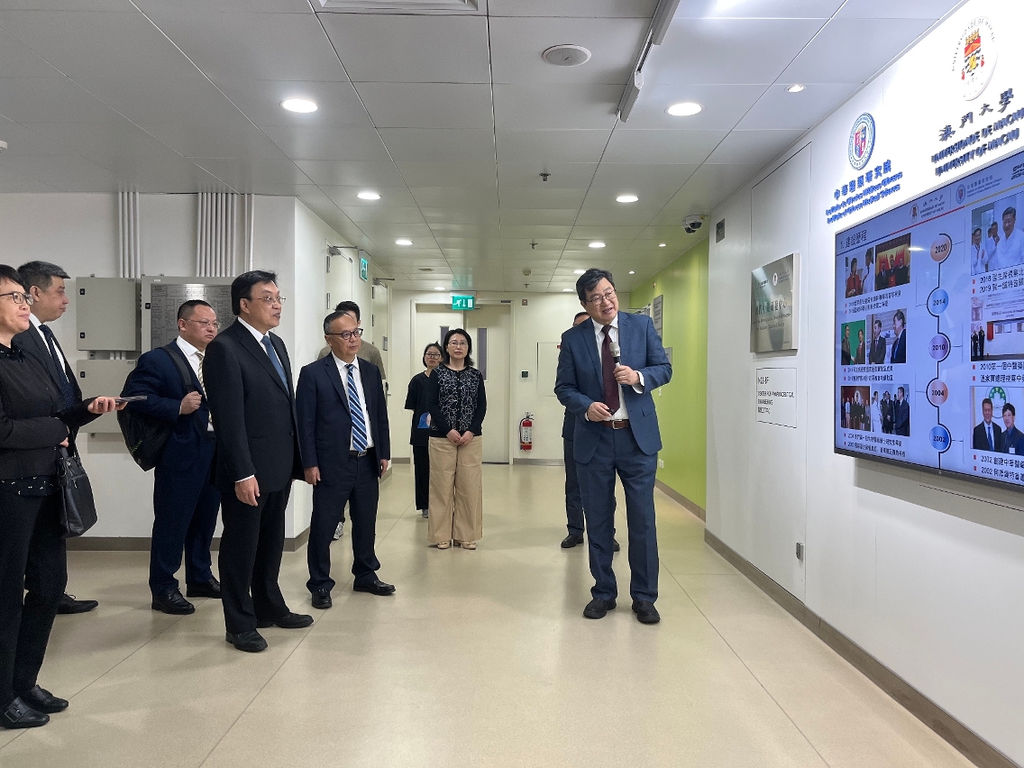 在澳大大學展館,宋永華向代表團介紹了澳大的學科建設與科研發展,以及澳大成為獨特大學的四個重要元素—— “特區大學、特殊使命、特別關懷、特色辦學”。代表團亦在澳大中華醫藥研究院院長陳新的介紹下參觀了澳大中藥質量研究國家重點實驗室,深入了解澳大近年在中藥創新研究方面取得的成果。馮飛對澳大近年的迅速發展給予肯定,期望澳大能與海南高校和企業拓展合作,共同推進瓊澳兩地交流。