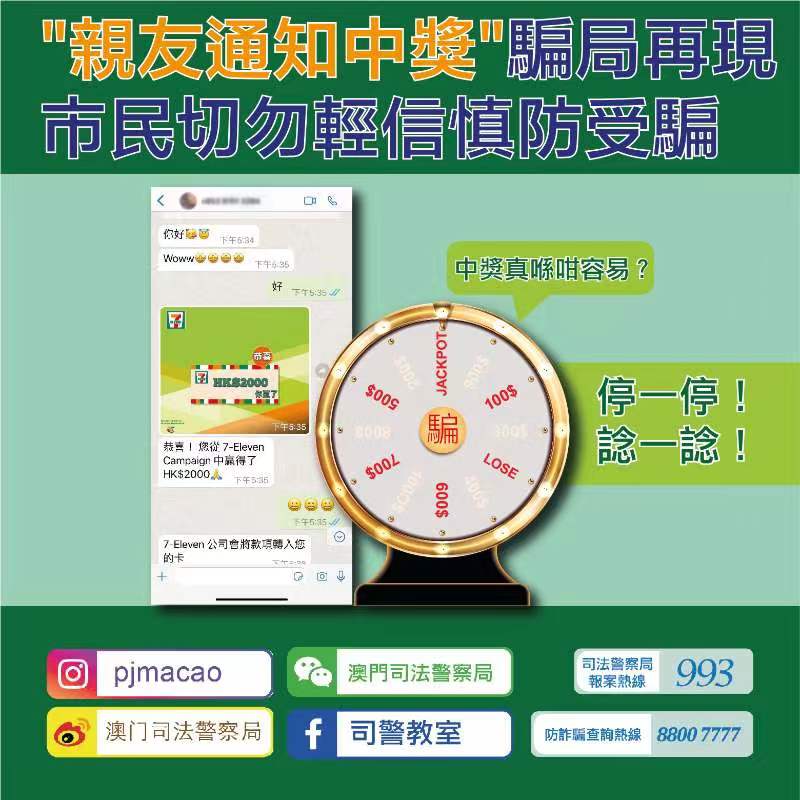 司法警察局今日接獲市民檢舉,指收到“朋友”的Whatsapp訊息,稱事主於7-11便利店舉辦的抽獎活動中獲得2,000獎金,要求事主提供信用卡照片及一次性驗證碼,以便將獎金存入事主的信用卡內。由於對方的頭像為其朋友,故事主相信並照辦,其後事主手機收到多筆信用卡交易短訊方知被騙,遂向本局報案求助。