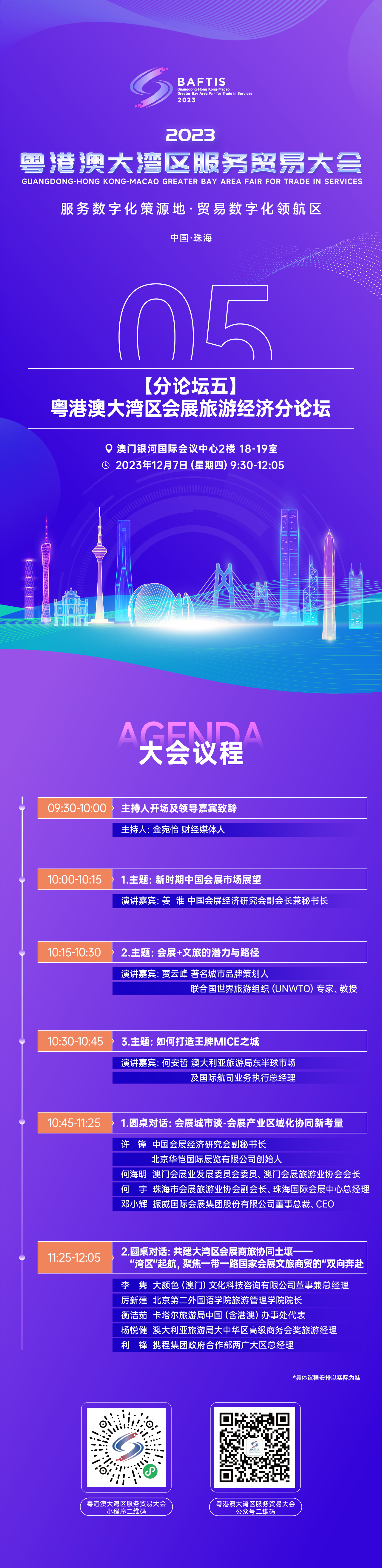 本屆大會設有開幕式暨主論壇和6個主題分論壇。其中,以“重新鏈接,多元會旅”為主題的“粵港澳大灣區會展旅遊經濟分論壇”將於12月7日在澳門銀河國際會議中心舉辦。論壇將匯聚多位海內外行業知名學者、專家、業內精英,以主題演講及圓桌對話方式,圍繞“新時期中國會展市場展望”、“會展+文旅的潛力與路徑”、“如何打造王牌MICE之城”、“會展城市談”、“共建大灣區文商旅協同效應”等方面共同探討會展商貿經濟的熱點問題及發展路徑,爲推動行業創新創建新思路。