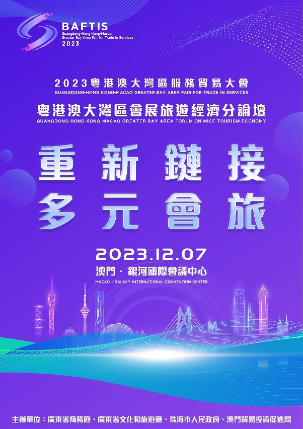 由廣東省商務廳、珠海市人民政府、香港商務及經濟發展局、澳門貿易投資促進局共同主辦的“2023粵港澳大灣區服務貿易大會”將於12月6至8日,採用“一會三地”的辦會模式,同時在珠海、香港、澳門三地設置會場,以“論壇+展覽+活動”的方式,全方位展示粵港澳大灣區服務貿易年度發展成果。以“重新鏈接,多元會旅”為主題的“粵港澳大灣區會展旅遊經濟澳門分論壇”將於12月7日舉辦。
