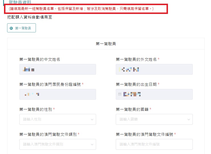 局方提醒“更換駕駛員”之申請人,須填寫新組合中所有駕駛員的資料,以免影響相關人士的駕駛資格。此外,申請人須留意“國際通行許可證”和“封閉道路通行許可證”的新證領取及舊證交還地點已調整為馬交石服務專區,且無需駕駛原配額車輛前往路氹城汽車檢驗中心檢視。