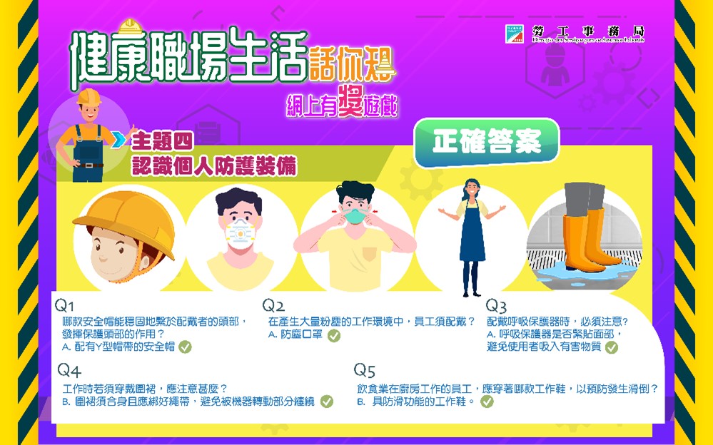 為持續提升市民的職業安全健康意識,加強對工作安全和健康的關注,勞工局於本年6至11月期間舉辦「健康職場生活話你知」系列有獎遊戲,四期活動共有17,683人次參與。其中,最後一期以認識個人防護裝備為主題的問答遊戲已於11月26日結束。是次活動反應熱烈,共有3,397人次參加,當中有3,337人次答對全部問題。