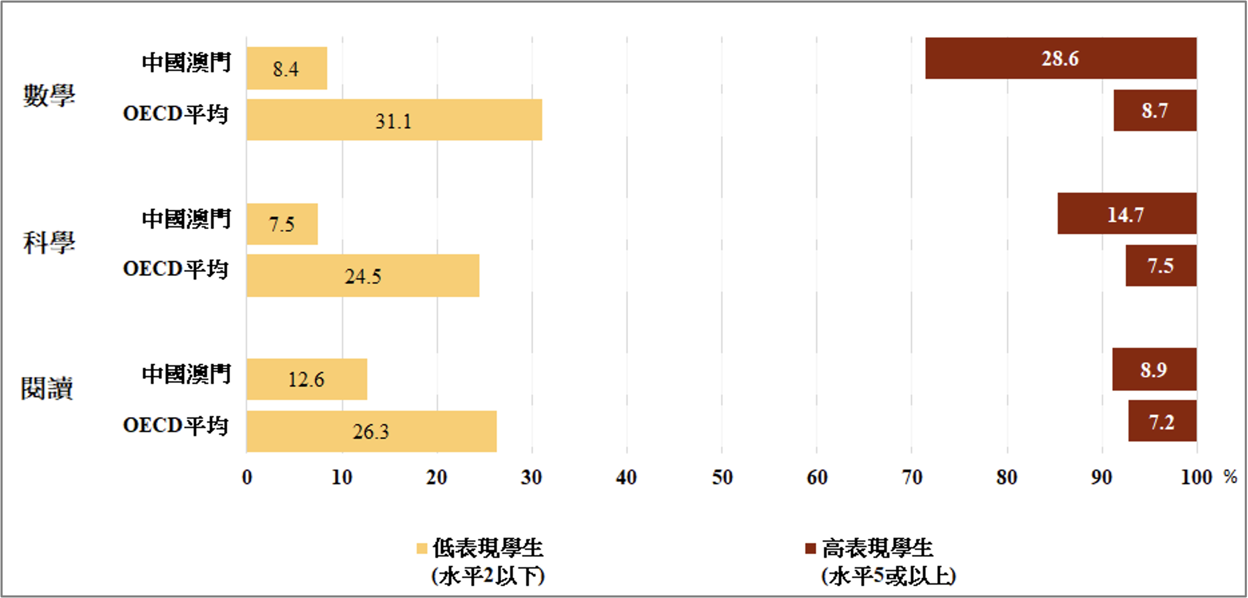 此外,澳門沒有達到基準水平(即水平2)的學生比例,在三個核心素養當中是全球各教育系統最小之一。澳門學校確保了幾乎全體15歲學生的三個核心素養都達到了有效參與社會事務的基本能力,並有機會充分發揮潛能,實現自己的目標。另一方面,澳門高表現生在數學有28.6%,科學有14.7%,閱讀有8.9%。因此,OECD 稱譽澳門的學校系統具有非常卓越的素養表現,同時具有非常優質的教育公平以及高度的包容性。