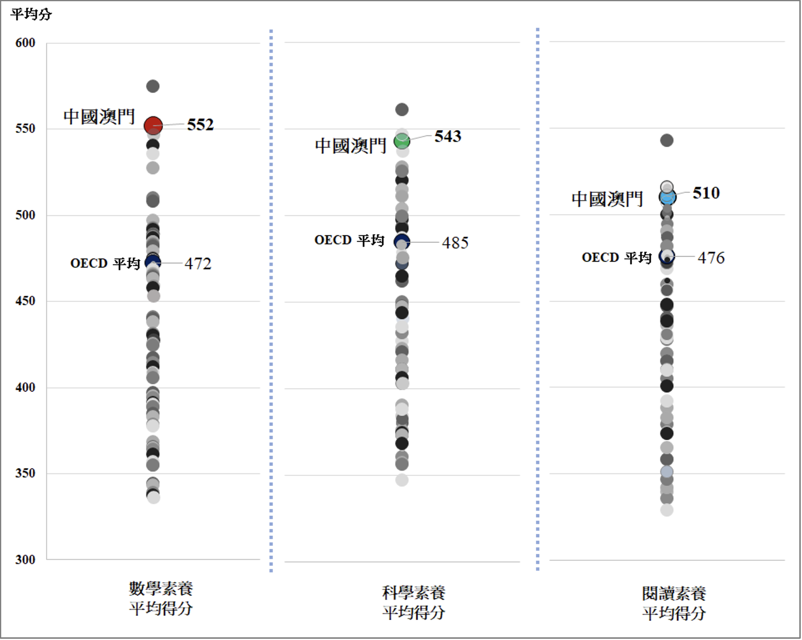 圖1:PISA 2022 數學、科學和閱讀表現概要