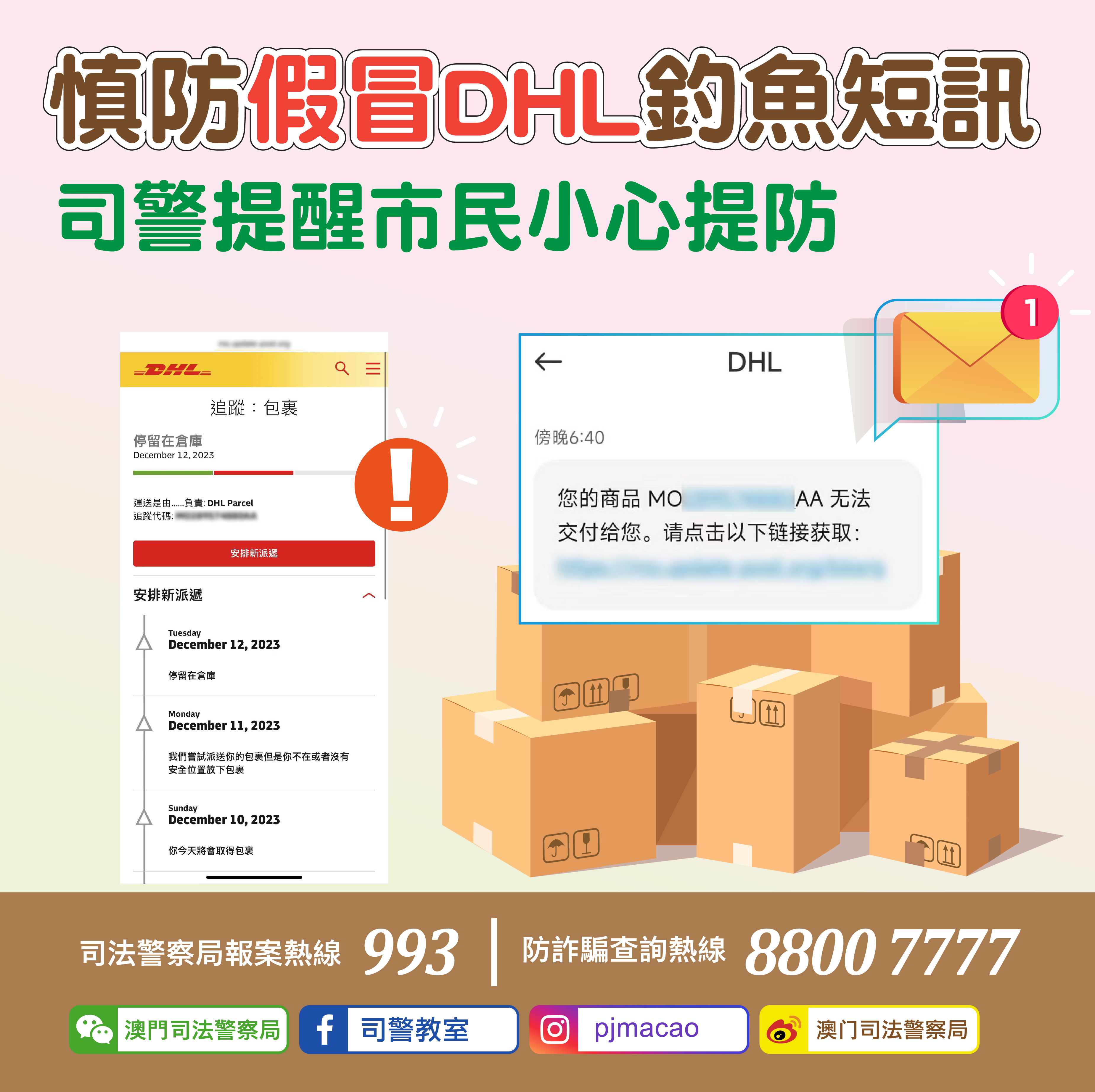 近日,司法警察局先後接獲多名市民舉報,稱收到假冒DHL快遞公司的詐騙短訊,以“商品無法交付”須繳付郵費為由,誘騙市民點擊短訊內的連結及輸入信用卡資料。
