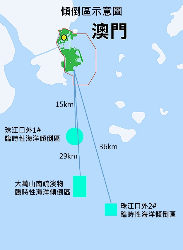 根據《關於澳門疏濬物在珠江口海域傾倒管理工作的合作安排》和《廢棄物海洋傾倒許可證核發事項辦事指南》相關的合作機制,明年1月1日起符合條件的海上工程項目,包括疏濬物總傾倒量大於10萬立方米的項目或日傾倒量大於7千立方米的項目,需向國家生態環境部珠江流域南海海域生態環境監督管理局進行申請,獲批准後把疏濬物運往珠江口海域的指定傾倒區進行跨區傾倒。傾倒區由內地當局安排,最近澳門的三個傾倒區,距離澳門約15至36公里。