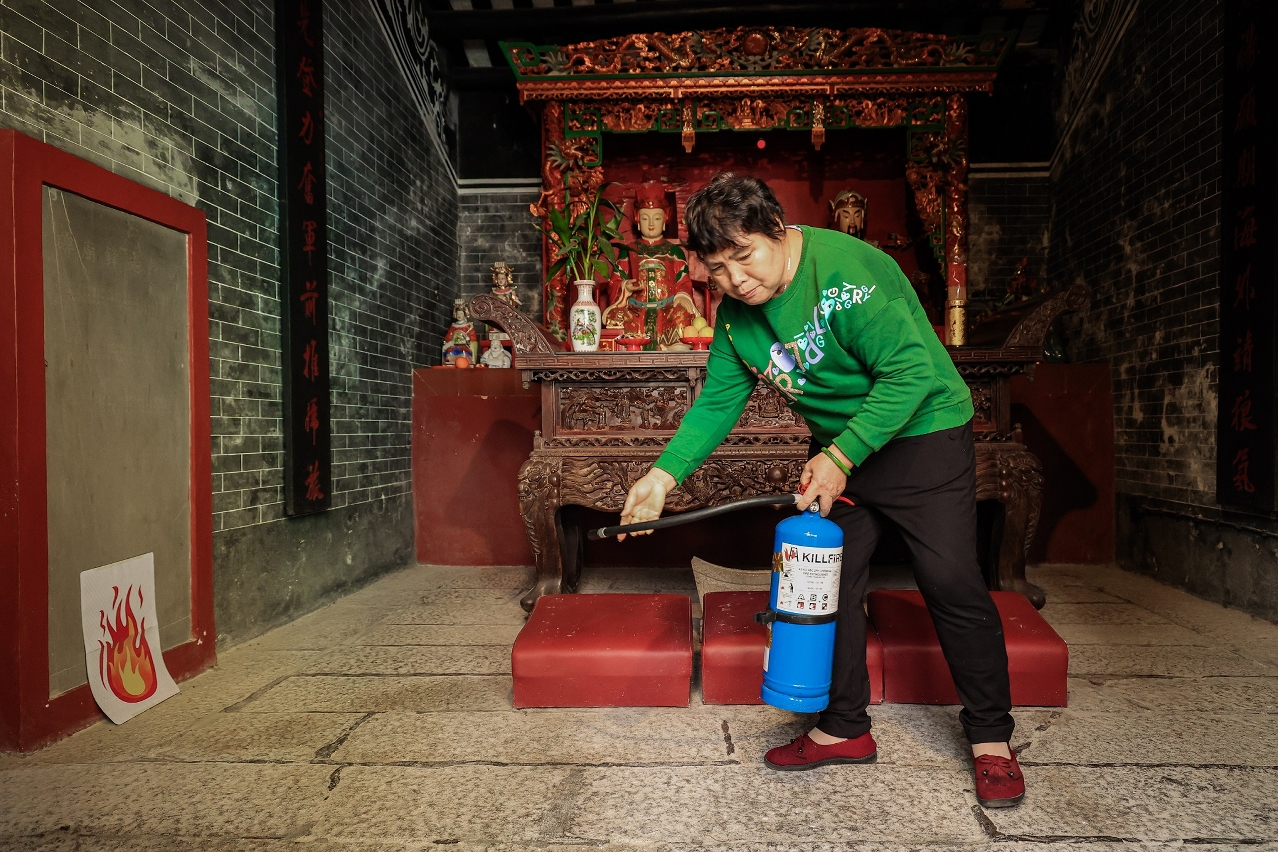 提高廟宇建築的消防安全,需仰賴前線管理人員日常良好的防火及安全管理意識。為此,文化局自2013年起定期聯同消防局,開辦針對廟宇管理人員的消防安全知識培訓,並自2020年起,培訓內容增設針對文物建築的火警演習。是次培訓獲得土地古廟(沙梨頭)及沙梨頭坊眾互助會的支持,借出場地及派員協助進行培訓及演習。