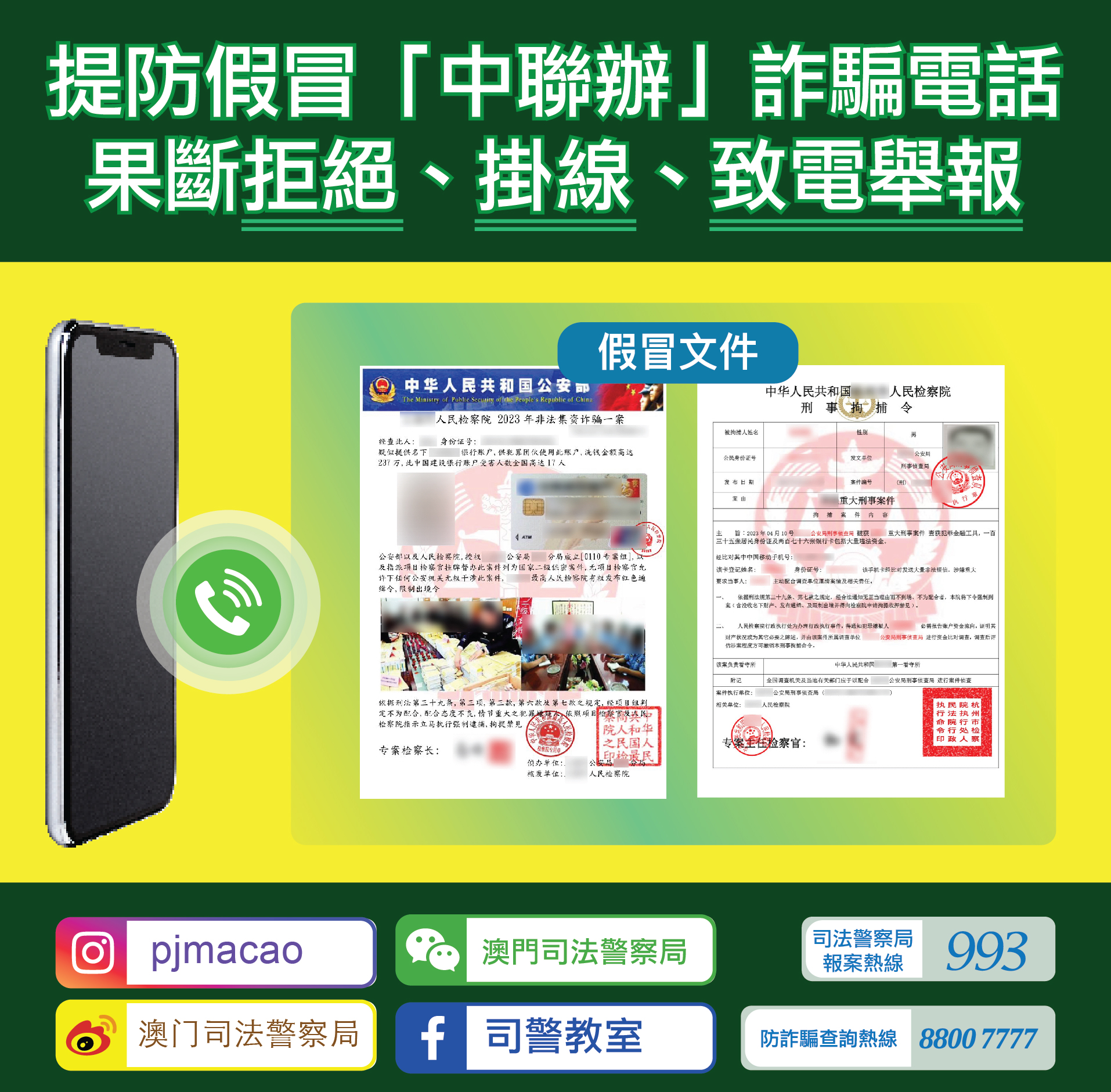 電話詐騙手法層出不窮,近月騙徒會假冒「澳門中聯辦」人員致電事主,並直接說出事主之姓名及證件號碼,訛稱事主於內地牽涉重大刑事案件,繼而轉駁電話至假公安機關;隨後騙徒會要求事主進行視頻辦案、共享屏幕、接受資金審查,甚至執行「特別任務」以「戴罪立功」等。