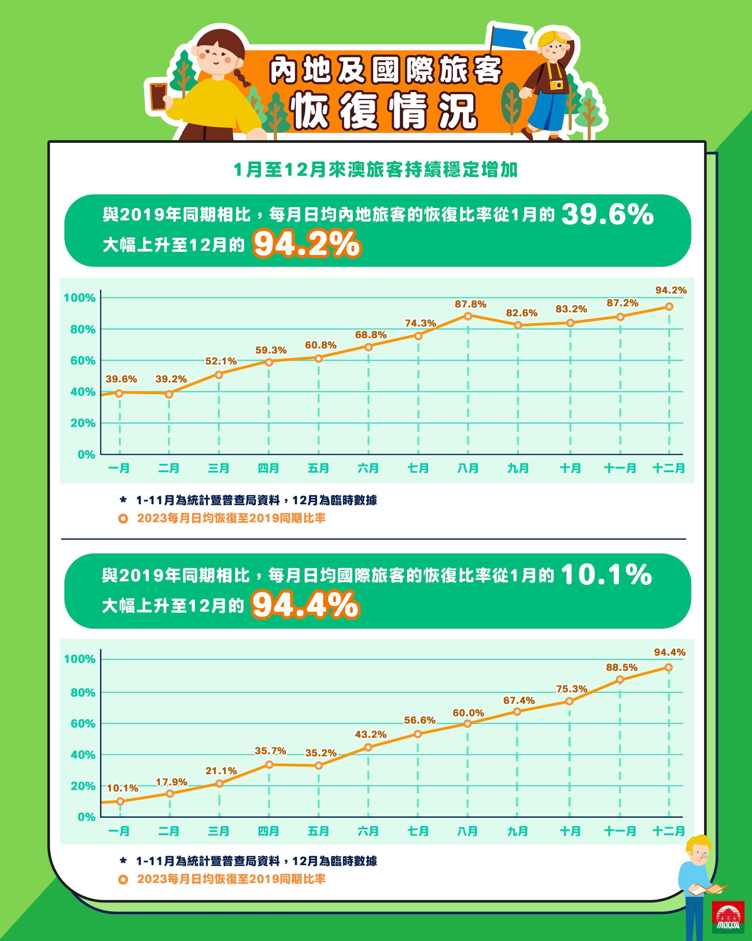 國際客源方面,復甦情況同樣顯著,2023年12月26日至30日連續5天均錄得超過1萬人次水平,當中12月30日更錄得12月最高國際旅客11,258人次入境,對比2019年12月最高國際旅客12,104人次,恢復率約為93%。根據臨時數據,每月日均國際旅客與2019年同期相比的恢復比率,從2023年1月的10.1%,大幅升至2023年12月的94.4%。