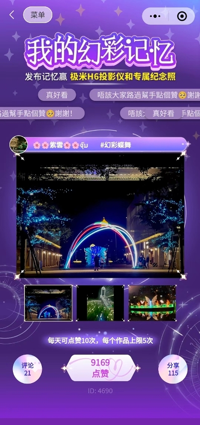 公眾在“2023幻彩耀濠江”各區的活動現場拍照打卡,標註 #2023幻彩耀濠江 或 #lightupmacao2023 或 #ilumninarmacau2023,分享至任何一個公開的社交媒體並集齊20個“讚”,可於諮詢站換取“2023幻彩耀濠江”主題紀念品乙個。