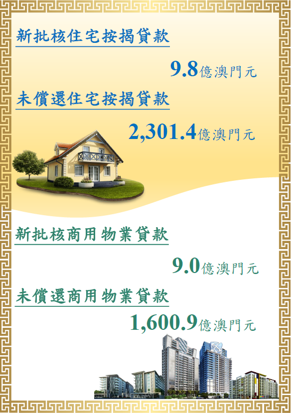 住宅按揭貸款是以澳門境內住宅物業作抵押借予個人及公司的信貸安排,包括用於購買住宅物業及其他用途(如:轉按/加按、營運資金及貿易融資等)。商用物業貸款是以澳門境內商用物業作抵押借予個人及公司的信貸安排,包括借予建築公司、用於物業發展及投資的貸款。