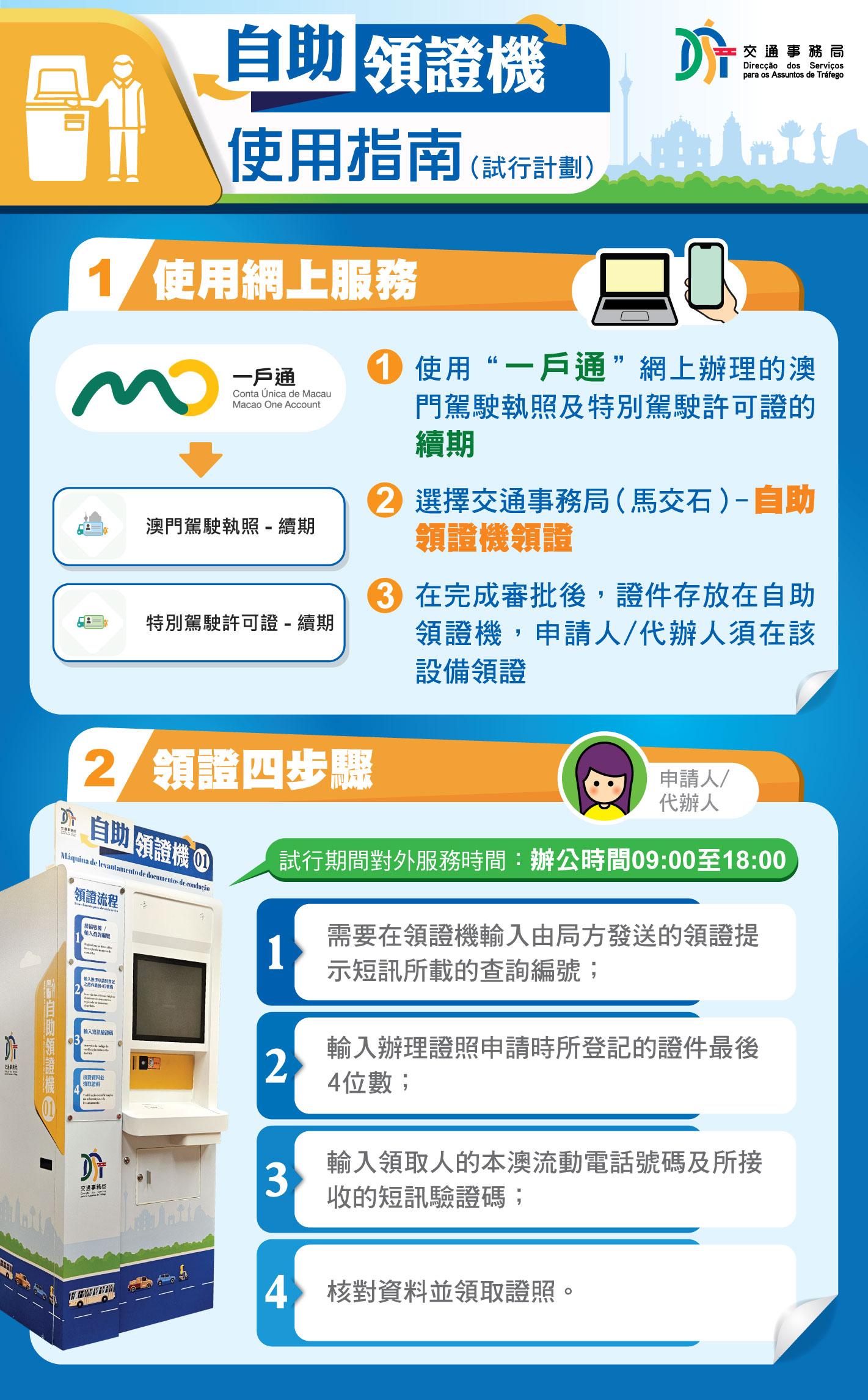 為進一步便利市民領取駕駛證照,交通事務局自2024年1月22日起,推出自助領證機領取駕駛證照的試行計劃,首階段適用於透過“一戶通”網上辦理的澳門駕駛執照及特別駕駛許可證的續期服務,且選擇交通事務局(馬交石) – 自助領證機領證的申請,在完成審批後,申請人/代辦人須在自助領證機取證,相關計劃為局方首個領證“不見面”(即毋須親臨櫃檯)服務,試行期間相關設備於辦公日的上午9時至下午6時開放予市民使用。