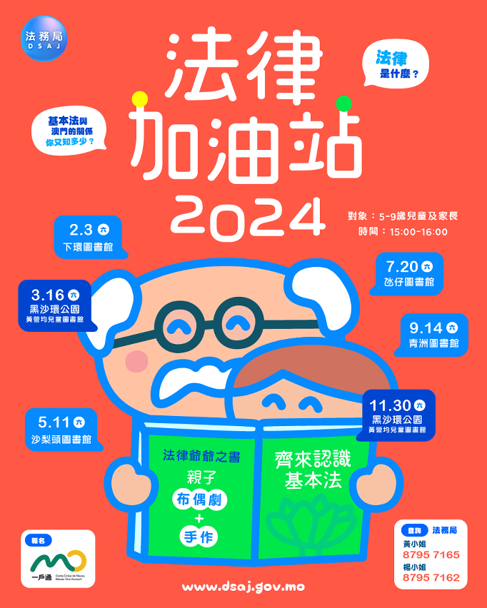 首場“法律加油站”將於2月3日下午3時至4時在下環圖書館舉行,歡迎本澳5至9歲兒童及家長參加,有興趣者可透過一戶通的“活動報名”頁面報名,每場名額8對親子,如報名人數超過數量,將以電腦抽籤方式決定。其餘五場“法律加油站”將分別於3月16日、5月11日、7月20日、9月14日及11月30日舉行,詳情請留意活動海報。如有任何查詢,歡迎致電法務局公共關係處黃小姐或楊小姐(8795 7165 / 8795 7162)。