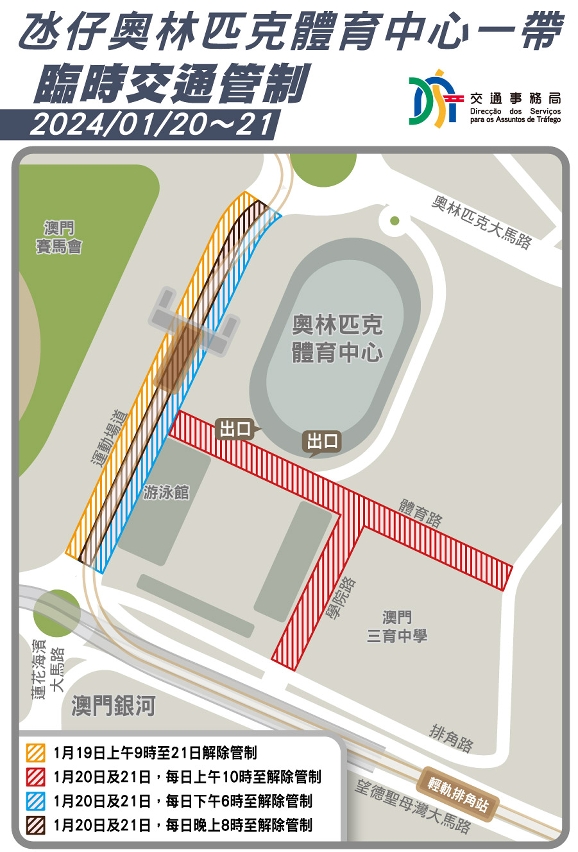 配合私人娛樂公司舉辦演唱會,1月19日(周五)至21日(周日)期間,氹仔奧林匹克體育中心-運動場周邊將實施一系列臨時交通措施。其中,配合警方在有需要時實施人流管制,“澳門運動場”站及“運動場/體育中心"站於1月20日(周六)上午10時起至21日(周日)臨時停用;而“華寶花園”站、“美景花園”站、“運動場/賽馬會”站及輕軌運動場站的行人天橋則於1月20日及21日每日晚上8時起臨時停用,直至解除管制,期間,輕軌運動場站亦會實施暫不上落措施,乘客可使用其他周邊巴士站搭乘相關路線,詳情請參閱兩巴網頁(http://www.tcm.com.mo 及http://www.transmac.com.mo)。
