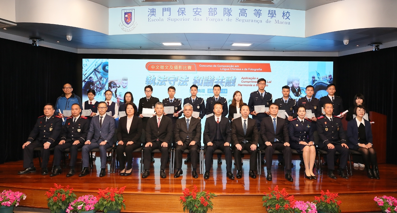 由澳門保安部隊及保安部門主辦,澳門保安部隊高等學校承辦的“執法守法,和諧共融”中文徵文及攝影比賽,於1月19日上午,在澳門保安部隊高等學校禮堂舉行頒奬典禮。典禮由保安司司長黃少澤親臨主禮,校方亦邀請到中聯辦警務聯絡部副部長王前進、警察總局局長梁文昌、澳門海關關長黃文忠、澳門保安部隊及保安部門的領導、賽事評委、各組別的得獎者,以及高等院校和中學代表等出席,共見獲獎者的喜悅時刻。