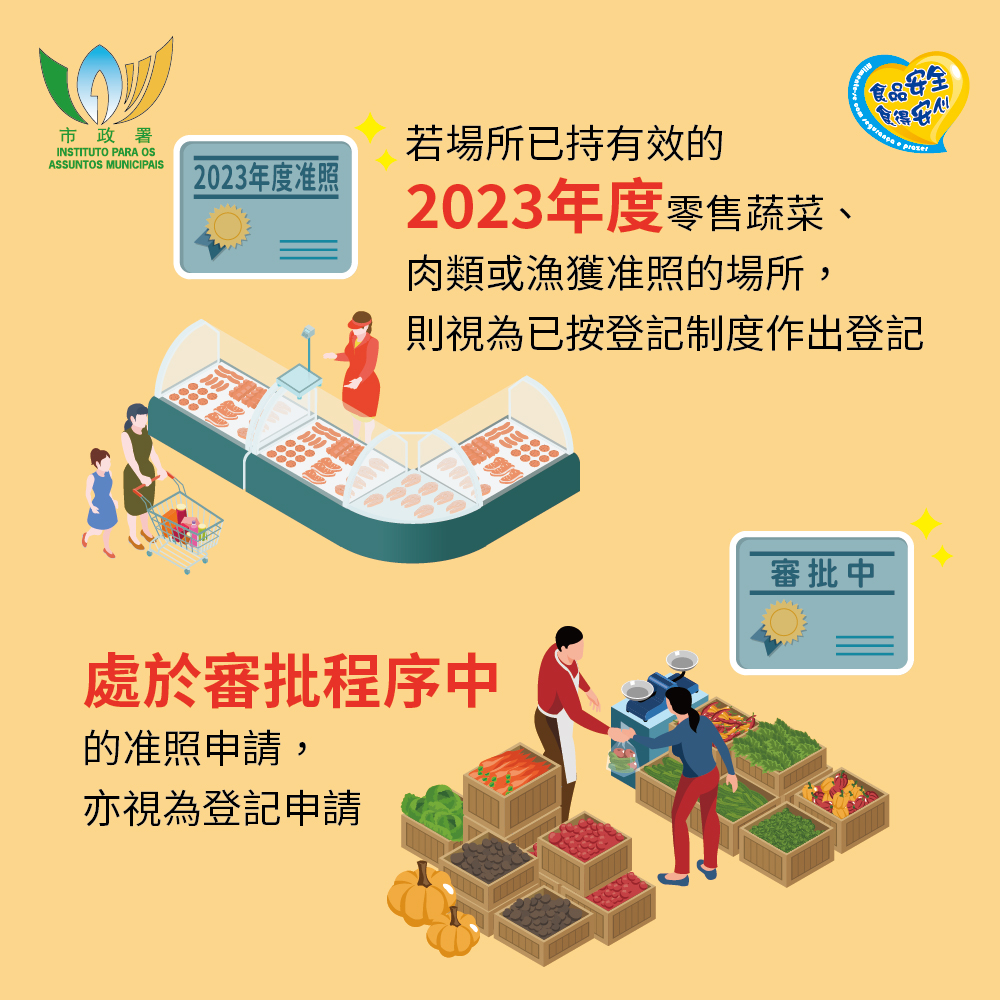 過渡期方面,若持有效的2023年度零售蔬菜、肉類或漁獲准照的場所,視為已按登記制度作出登記,准照持有人無須向市政署提出2024年度准照續期申請。此外,行政法規生效前處於審批程序中的准照申請,亦視為登記申請。市政署已向有關商戶發出公函及短訊,通知其於2月1日至7日辦公時間內到市政署食品安全廳領取登記證明。