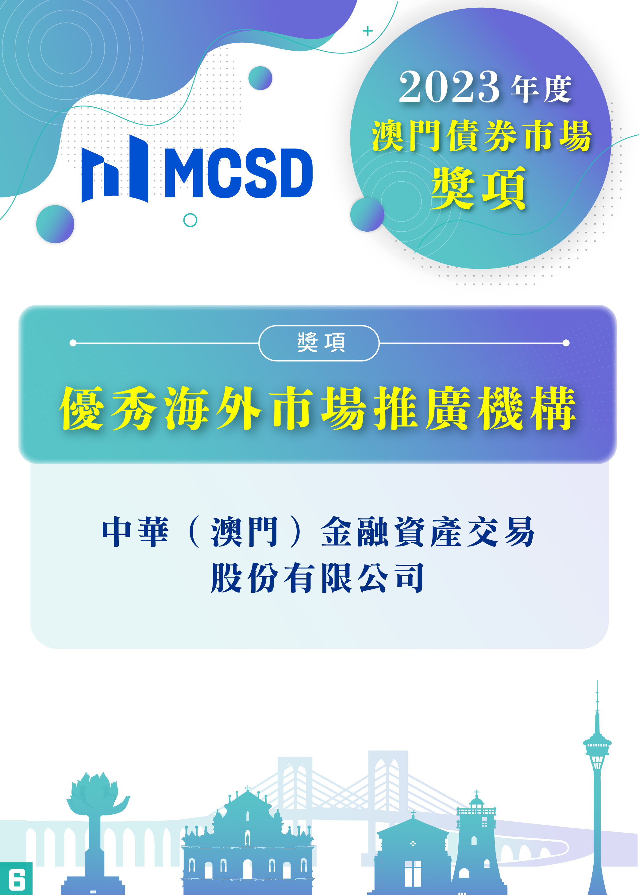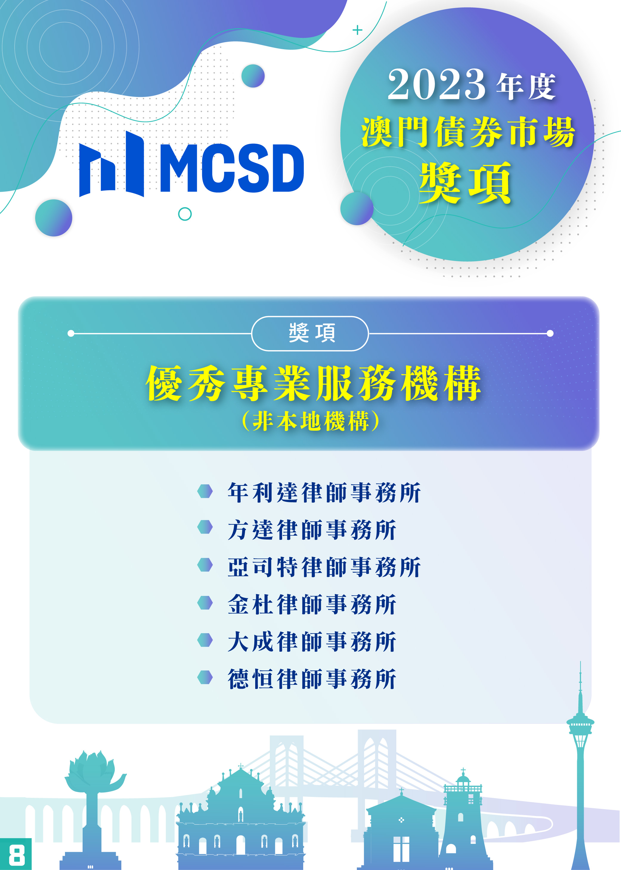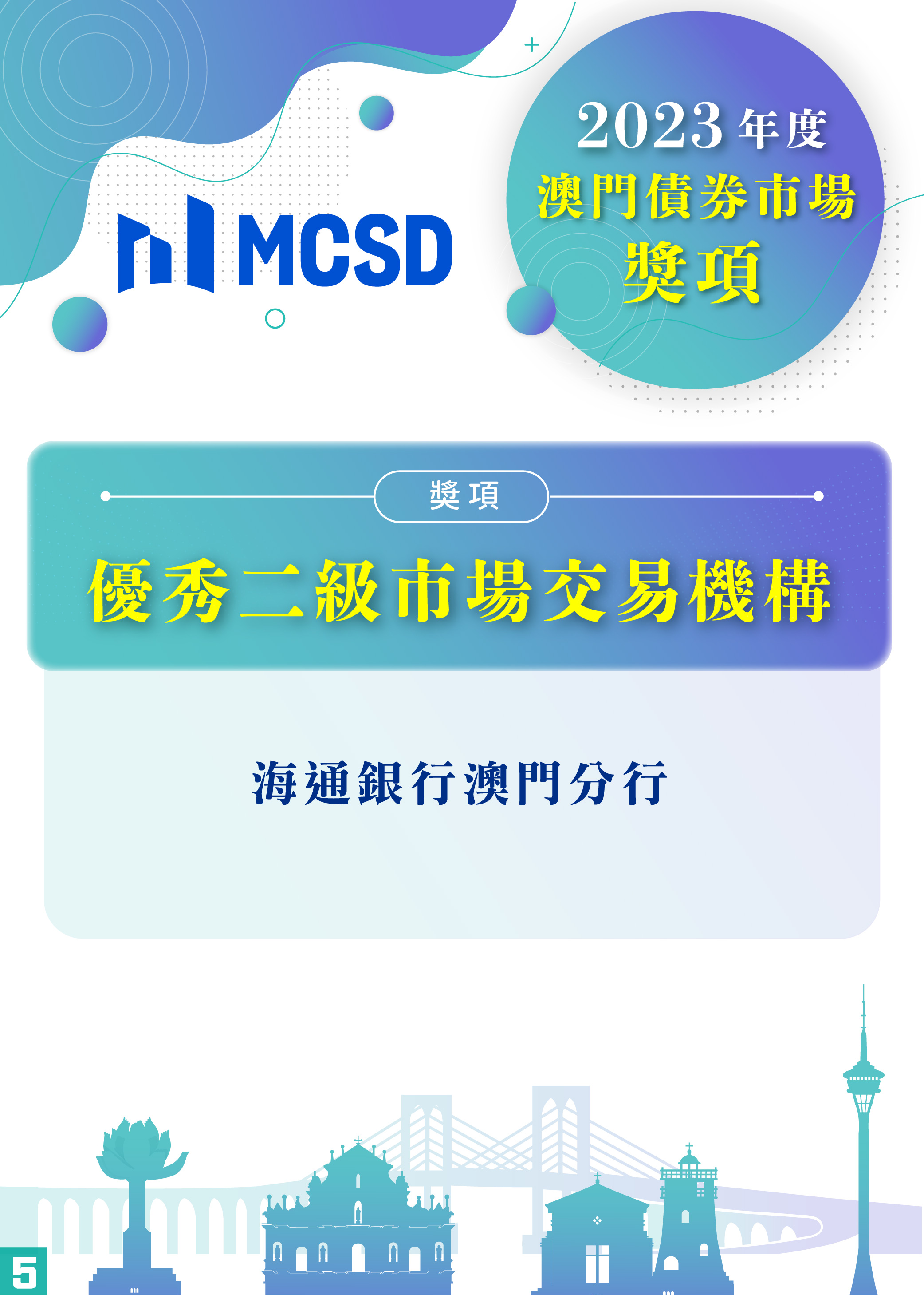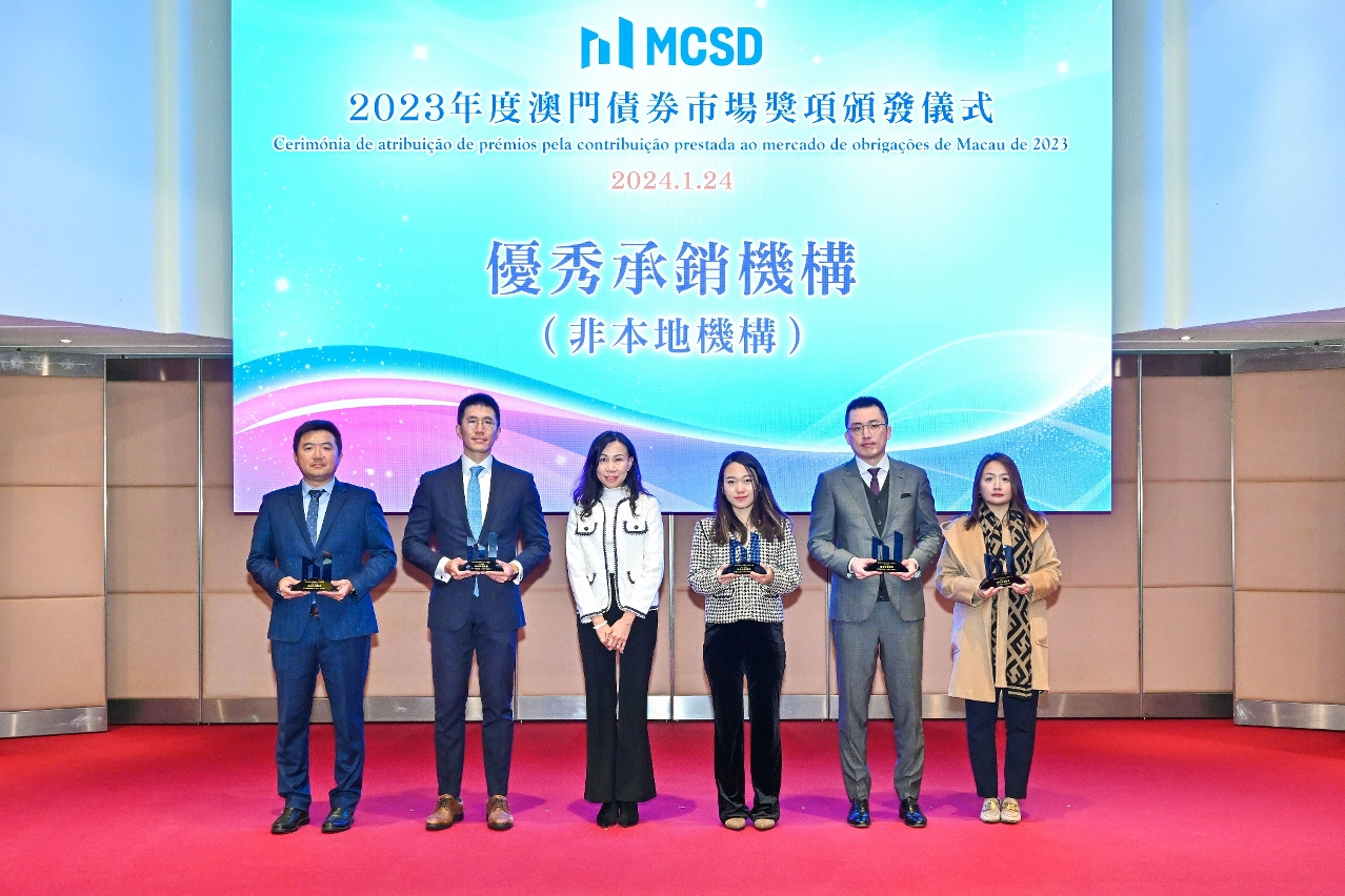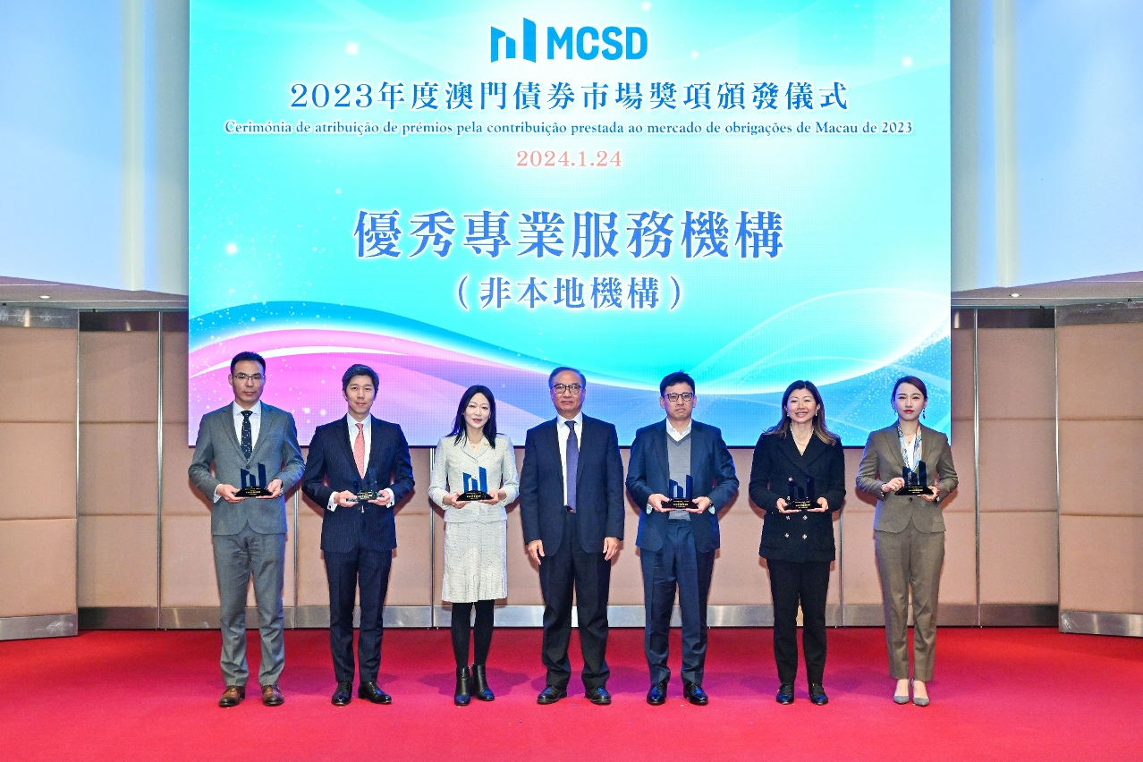 為嘉許在2023年對澳門債券市場作出突出貢獻的市場參與者, MCSD於活動上頒發6個獎項,包括原有的“優秀承銷機構”、“優秀發行機構”和“優秀海外市場推廣機構”,以及本次新增的“ESG突出貢獻機構 ”、“優秀二級市場交易機構” 和“優秀專業服務機構”,合共27家本地及境外機構獲獎。
