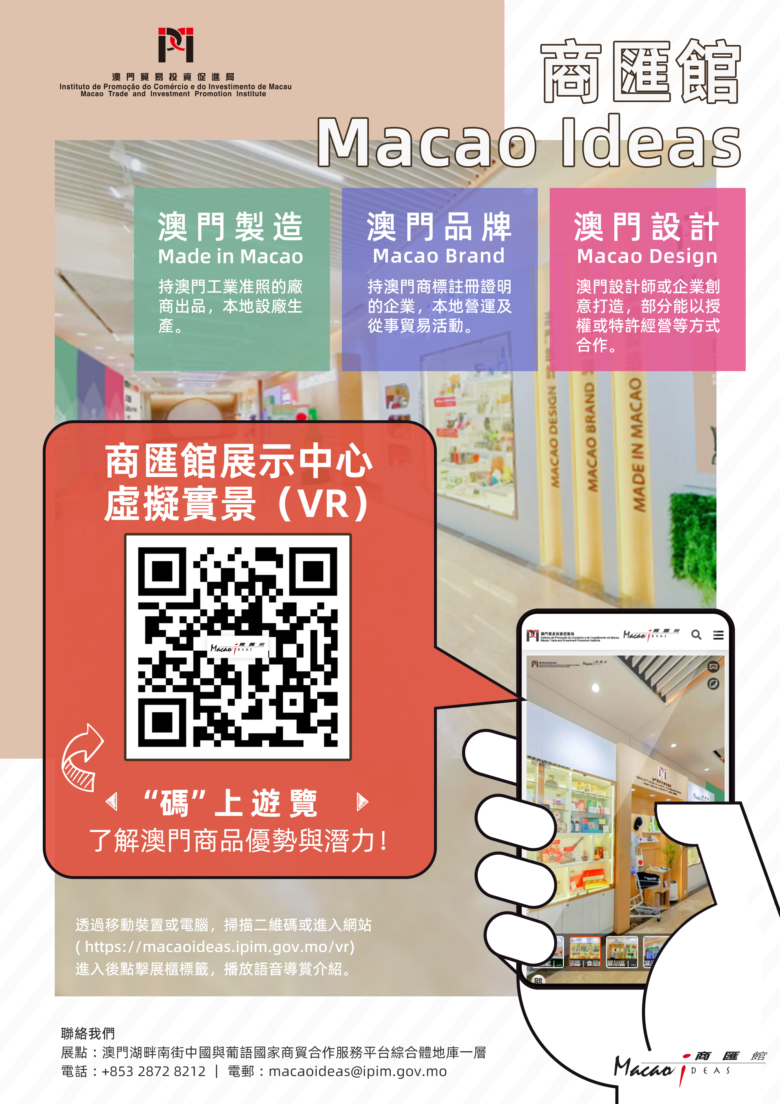 匯聚逾100間本地企業、近1,700件“澳門製造”、“澳門品牌”、“澳門設計”商品的澳門貿易資促進局商匯館網站(https://macaoideas.ipim.gov.mo/)全面升級,在多媒體內容基礎上重點增設線上虛擬實境(VR)展示、優化關鍵字搜尋及社交平台一鍵分享功能等,助海內外客商省時便捷地一站式瞭解澳門質優物美的產品。