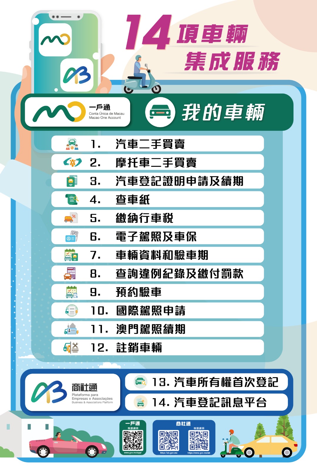 其中,“一戶通”共提供12項車輛集成服務,具體包括:汽車二手買賣、摩托車二手買賣、汽車登記證明申請及續期、查車紙、繳納行車稅、電子駕照及車保、車輛資料及驗車期、違例紀綠及繳付罰款、預約驗車、國際駕照申請、澳門駕照續期、註銷車輛。此外,“商社通”提供的2項車輛集成服務,分別為:汽車所有權首次登記、汽車登記訊息平台。