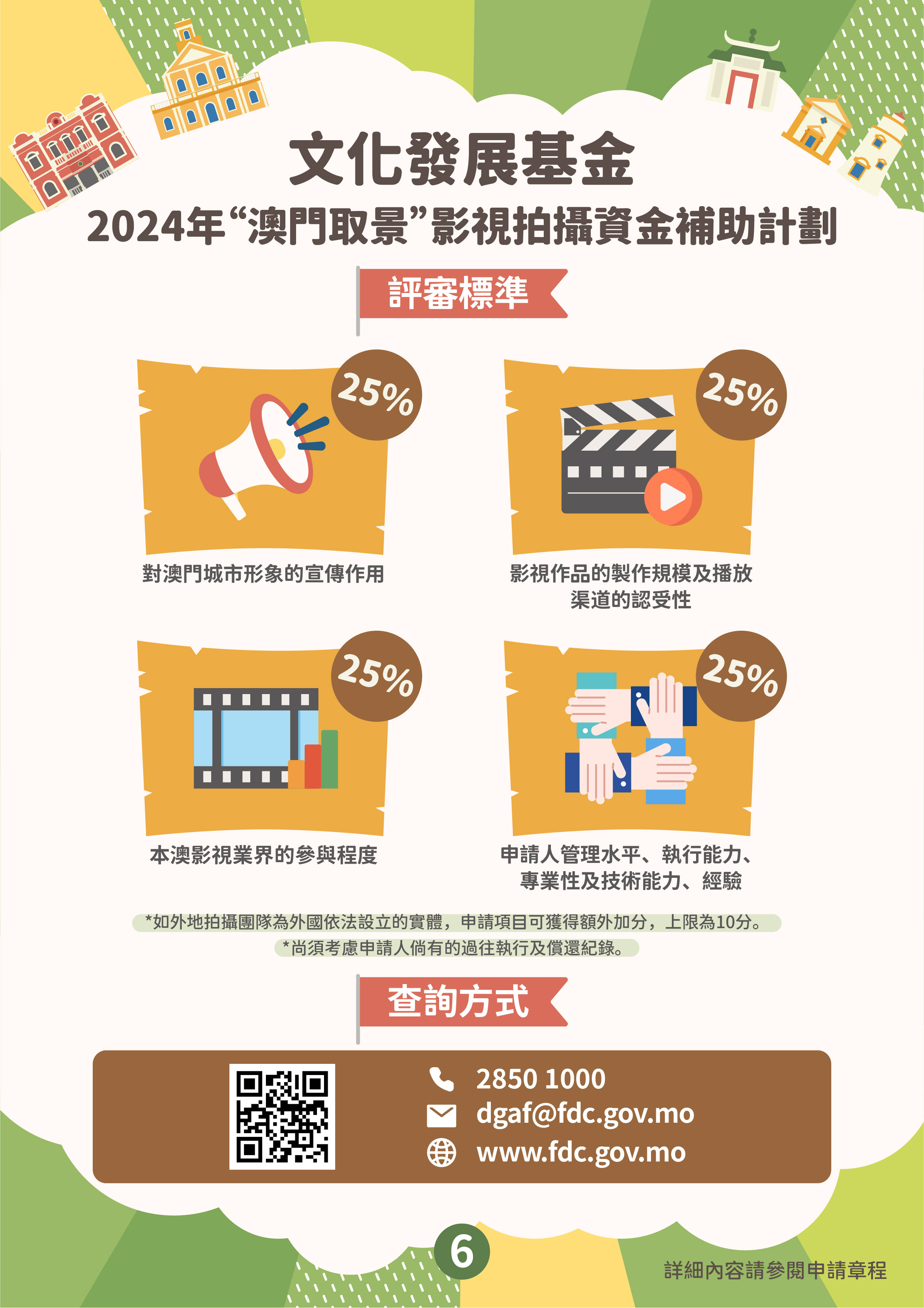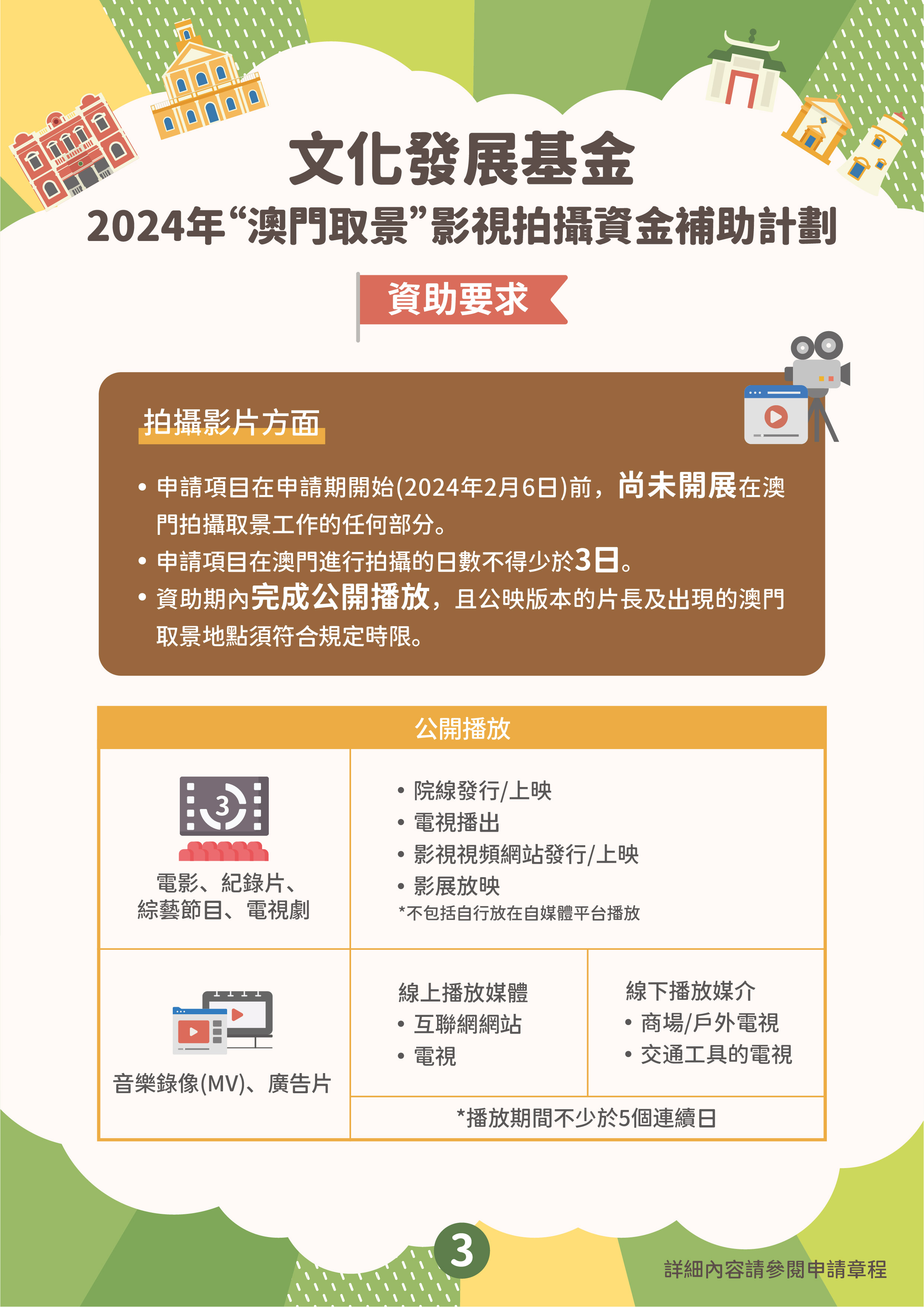 “澳門取景”影視拍攝資金補助計劃的目的是吸引外地拍攝團隊到澳門取景,通過影視作品宣傳推廣澳門形象,提升澳門的國際知名度,並為本地影視企業提供更多參與拍攝外地影視作品的機會。資助計劃接受在申請期開始前(即2024年2月6日前)、尚未開展在澳門取景拍攝工作且在澳拍攝的日數不少於3天的外地影視項目,由外地拍攝團隊主導並來澳參與拍攝工作。資助申請須由作為澳門製片單位的澳門商業企業主提出,其所營事業須與影視製作相關。獲資助的影視項目須在資助期內完成公開播放,公映版本的片長及片中出現澳門取景點的時長,須符合章程規定的時限要求。批給資助上限為申請項目在澳門進行拍攝取景工作預算支出的40%,上限為200萬澳門元。