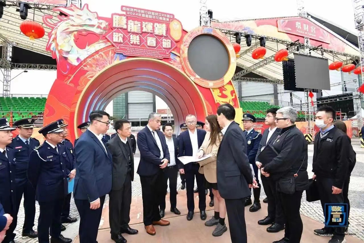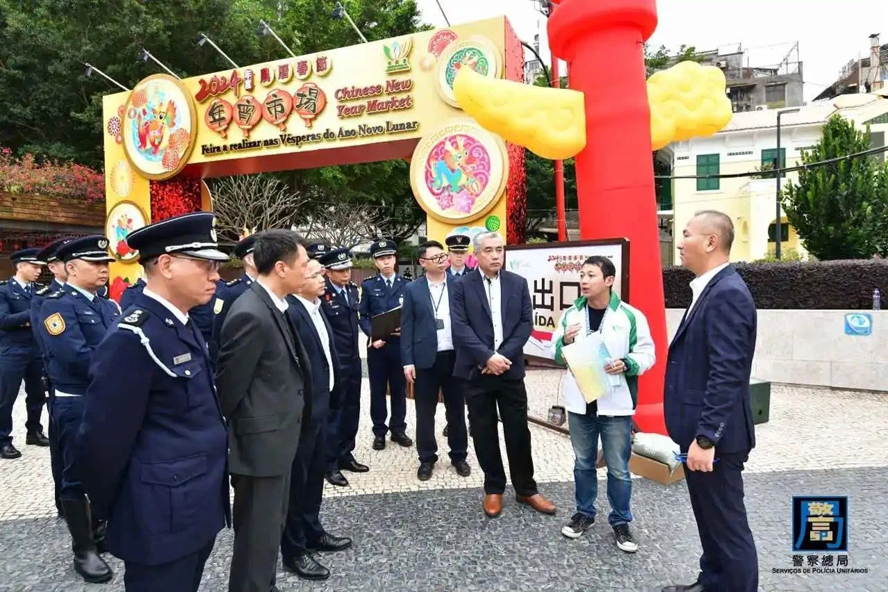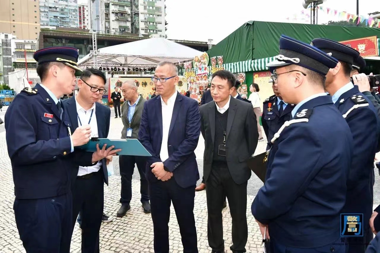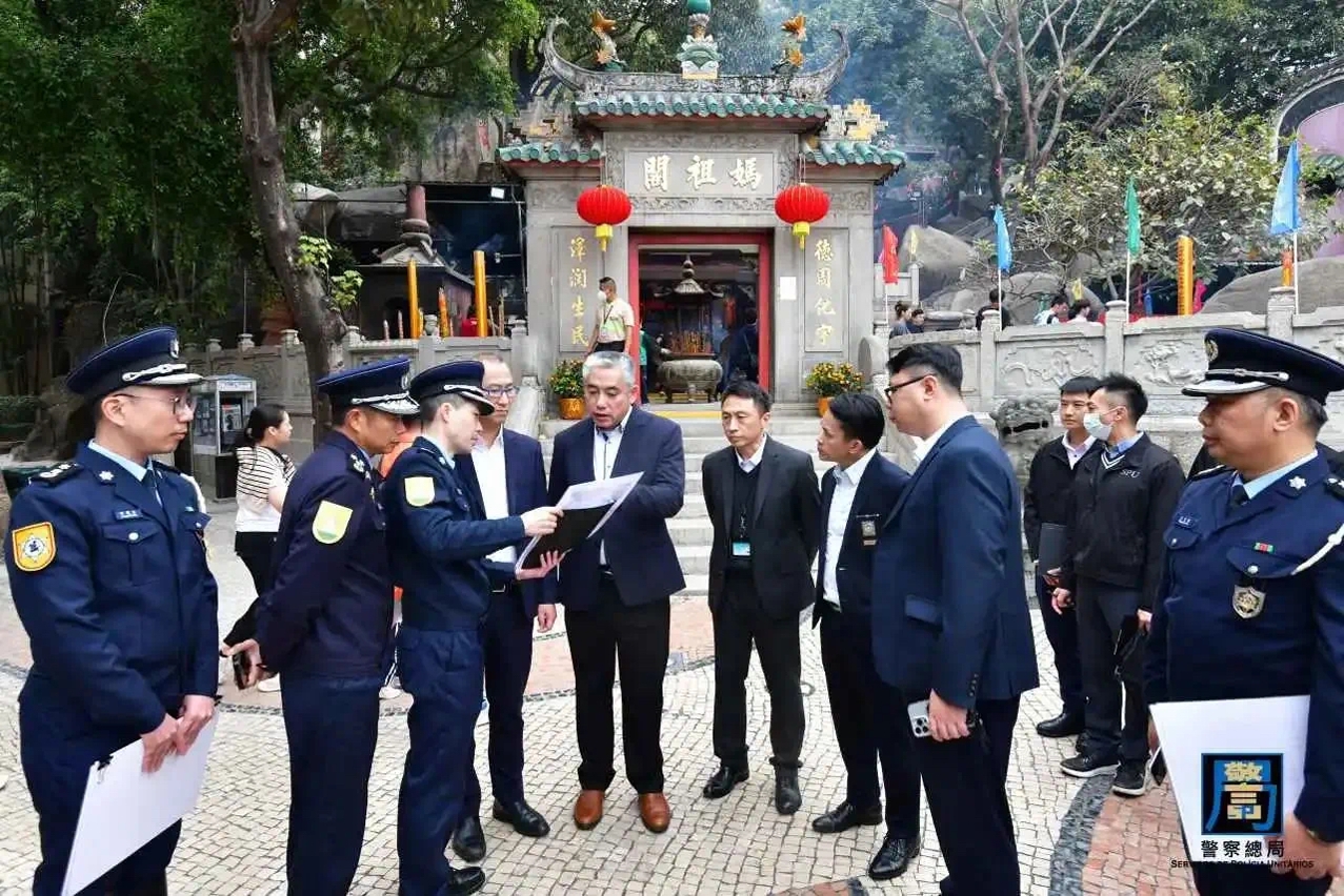 農曆新年將至,本澳將舉辦多項大型賀歲節慶活動,預計將吸引大量旅客訪澳,為保障新春前後本澳的公共秩序與安全,確保市民及旅客歡度佳節,警察總局梁文照局長助理聯同澳門海關葉華釗代助理關長、旅遊局許耀明副局長、治安警察局梁慶康副局長、司法警察局蘇兆強副局長、消防局林俊生代副局長,以及交通事務局、市政署和文化局等多名領導及主管人員,於今(6)日前往媽閣廟、花車巡遊沿線、塔石廣場年宵攤位等地進行實地巡視,聽取各警務單位及相關部門在新春期間的工作部署,包括警務、交通、人流管制及緊急救援措施等,亦了解新年煙花表演期間的工作安排。