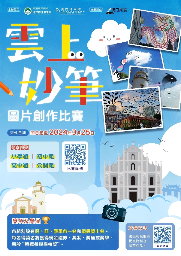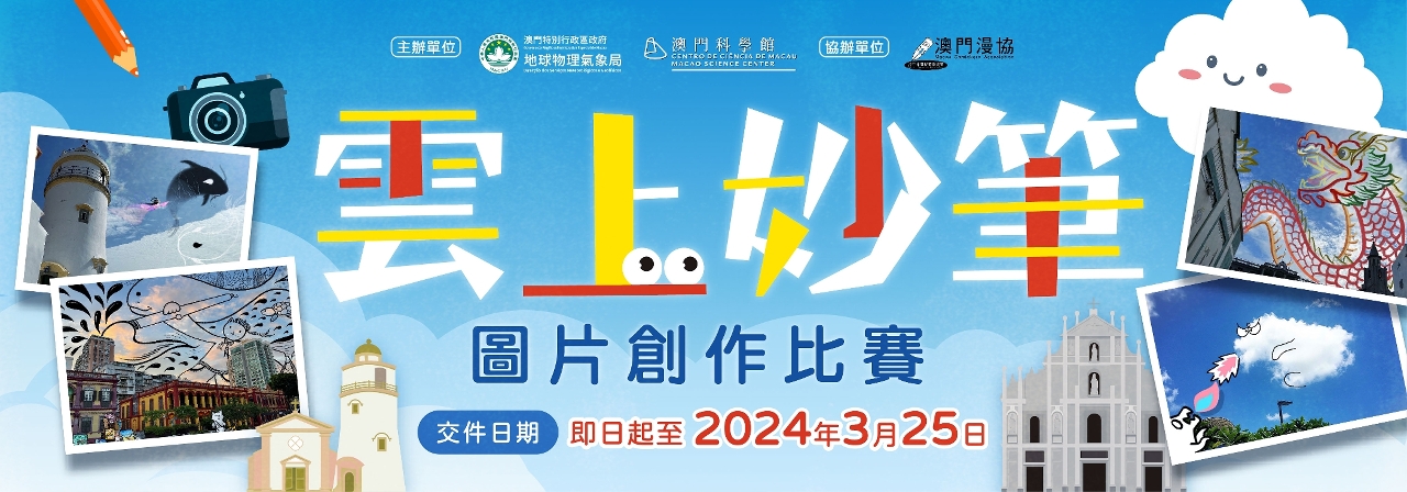作為世界氣象組織的地區成員,為慶祝3月23日“世界氣象日”,以紀念於1950年生效的《世界氣象組織公約》,地球物理氣象局與澳門科學館合辦、澳門漫畫從業員協會協辦“雲上妙筆圖片創作比賽”,藉以提高公眾對天氣的關注和加深對雲種等氣象知識的瞭解。比賽由即日起至2024年3月25日接受報名,歡迎合資格人士踴躍參與。