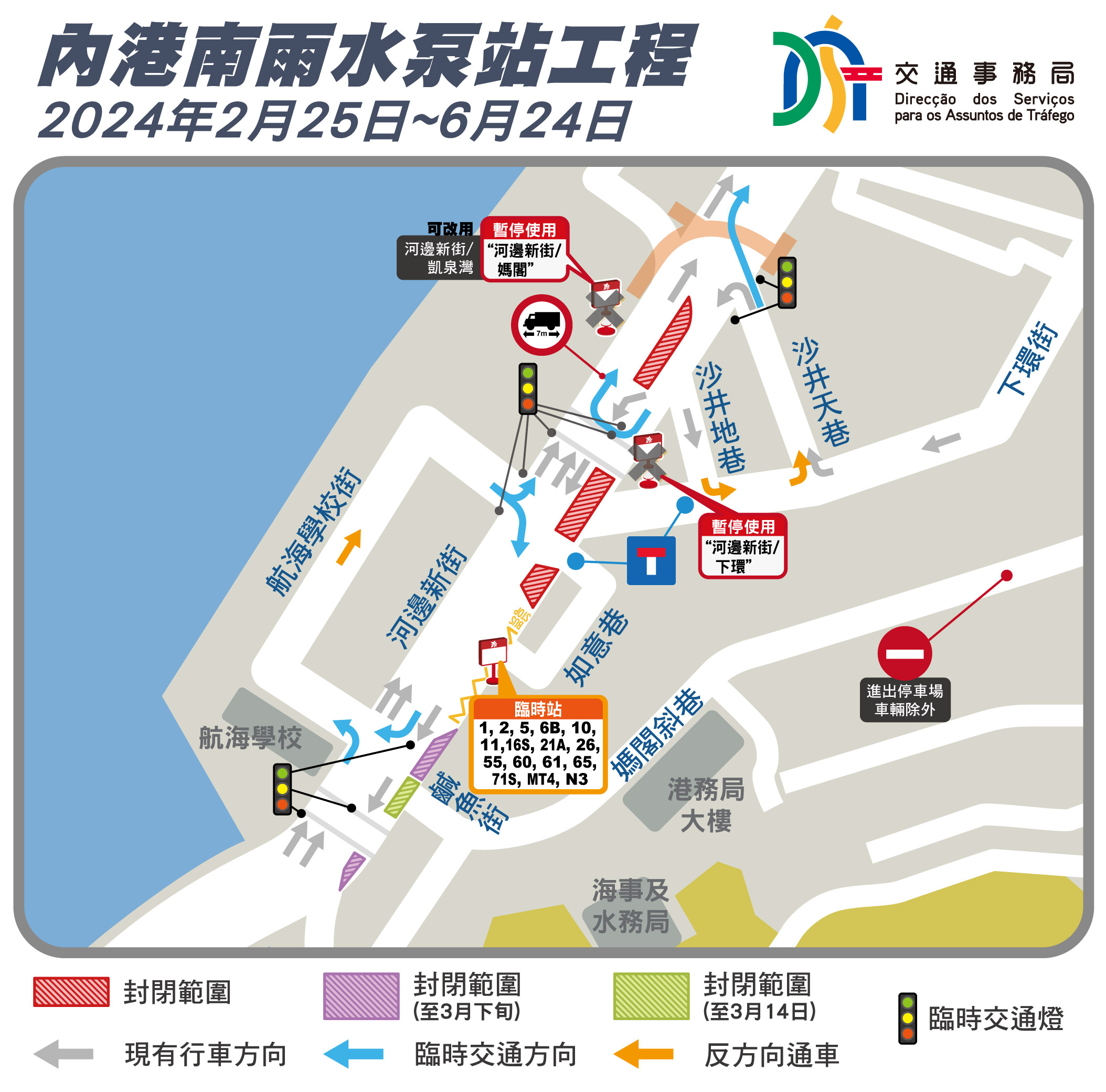 配合內港南雨水泵站及下水道工程推進,下環街近河邊新街的路段、如意巷於 2月25日(周日)起實施無出口道路措施(即經下環街進入,車輛不能通往媽閣方向),屆時車輛須經沙井天巷駛往河邊新街,當局並於河邊新街、沙井天巷交界及航海學校附近增設臨時交通燈,以保障車輛及行人安全。同一時間,鹹魚街近河邊新街亦將封閉交通至3月中旬,周邊新大廈會配合施工,詳見可參閱附表。
