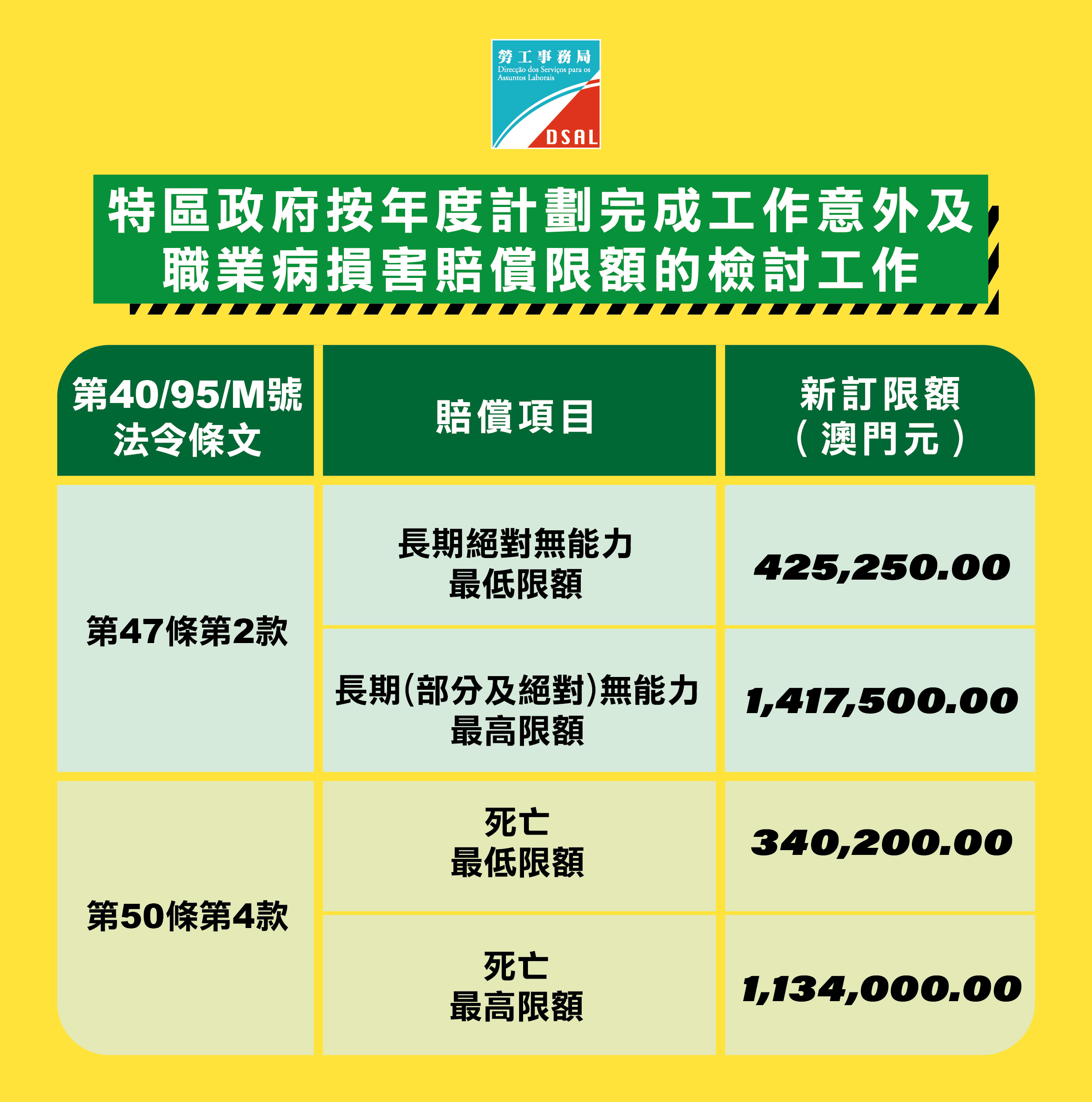新訂限額如下:第40/95/M號法令條文中第47條第2款中"長期絕對無能力最低限額"和"長期(部分及絕對)無能力最高限額"的新訂限額分別為澳門元425,250和澳門元1,417,500;第50條第4款中"死亡最低限額"和"死亡最高限額"的新訂限額分別是澳門元340,200和澳門元1,134,000。