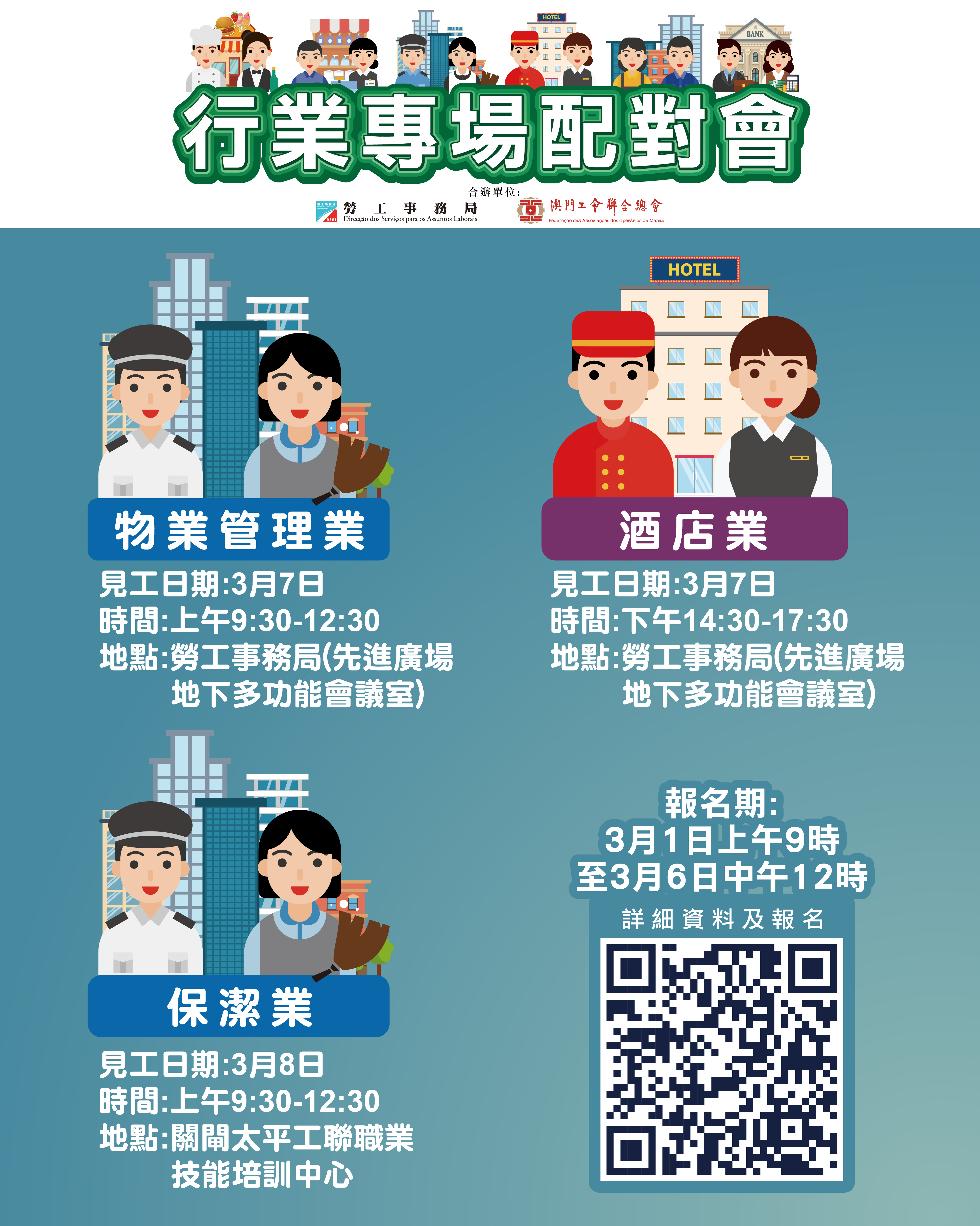上述3月7日上午物管業配對會及下午酒店業配對會在澳門勞工事務局地下多功能會議室(澳門馬揸度博士大馬路221-279號先進廣場大廈)舉行;3月8日上午保潔業配對會在澳門工聯職業技能培訓中心(關閘馬路101-105A號太平工業大廈第一期1樓)舉行。報名日期為3月1日上午9時至3月6日中午12時。