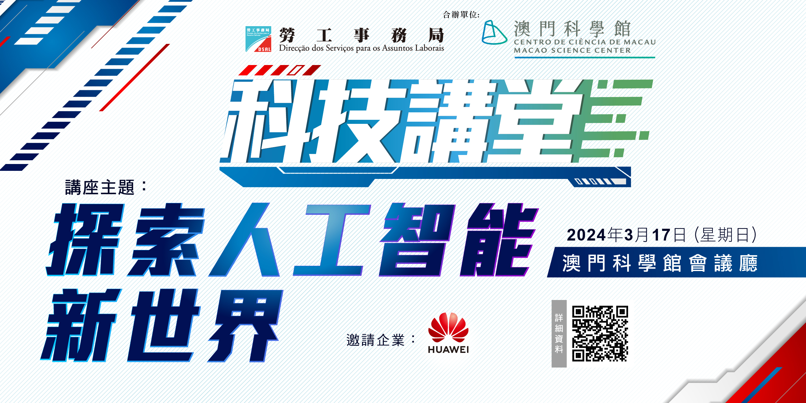 為配合特區政府積極推動“1+4”適度多元發展策略,讓求學中的青少年學生及早接觸高新科技產業,勞工事務局與澳門科學館合作推出「科技講堂」系列講座,首場講座邀請華為服務(香港)有限公司-澳門分公司(下稱“華為澳門”)專家主講,主題為“探索人工智能新世界,並定於3月17日假澳門科學館會議廳舉行,3月4日起接受網上報名。